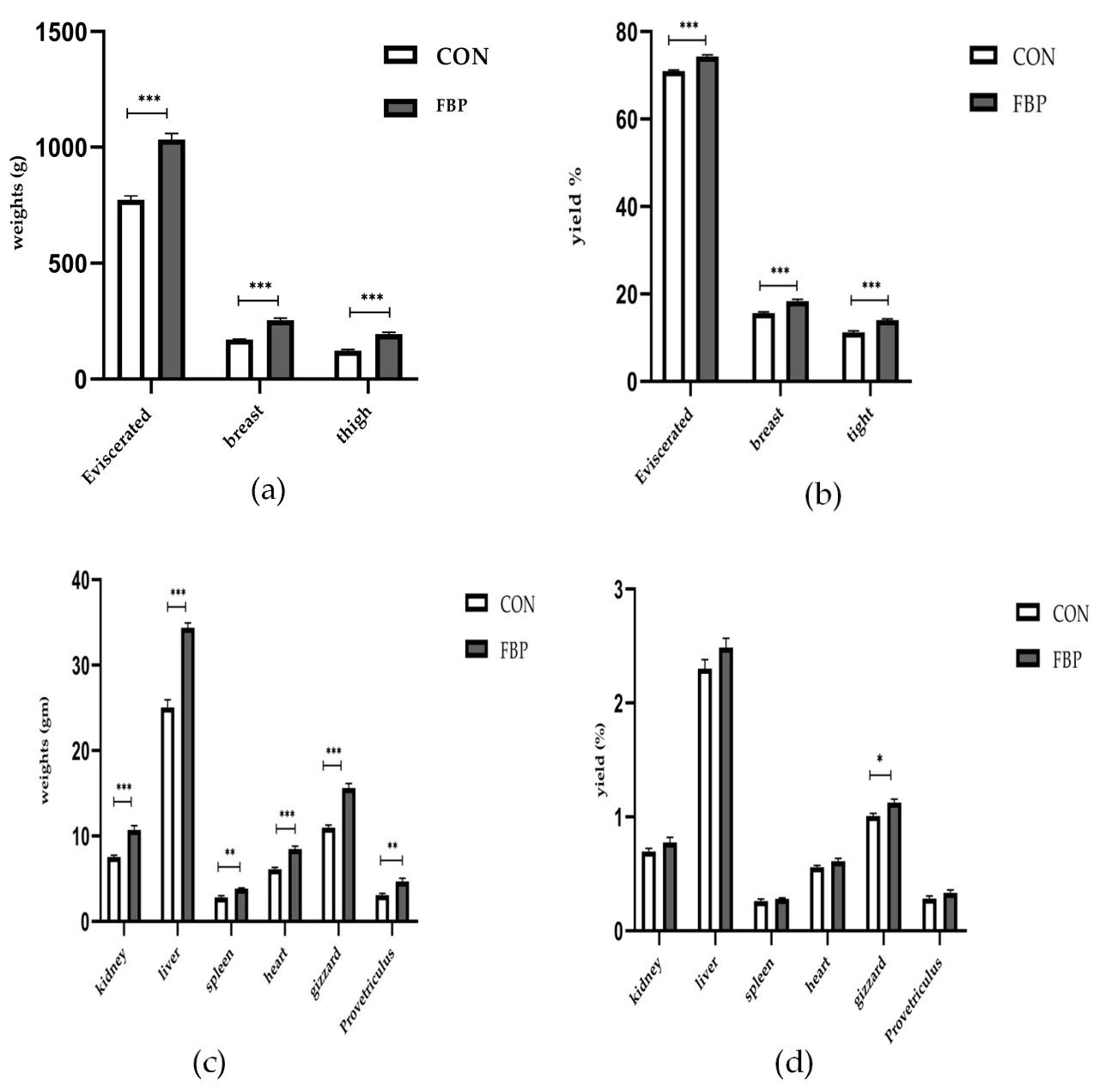Потрошеная масса, а также масса и индексы грудных и бедренных мышц значительно увеличились у цыплят, получавших рацион с ФБП, превосходя показатели контрольной группы (p = 0,05). Однако мы наблюдали значимые различия в массе органов между контрольной группой и группой ФБП (p > 0,05). Рисунок 1 показывает, что включение ФБП в базовый рацион стабильно увеличивало массу как тушки, так и органов. Это указывает на то, что добавка к рациону оказала влияние на рост организма в целом.