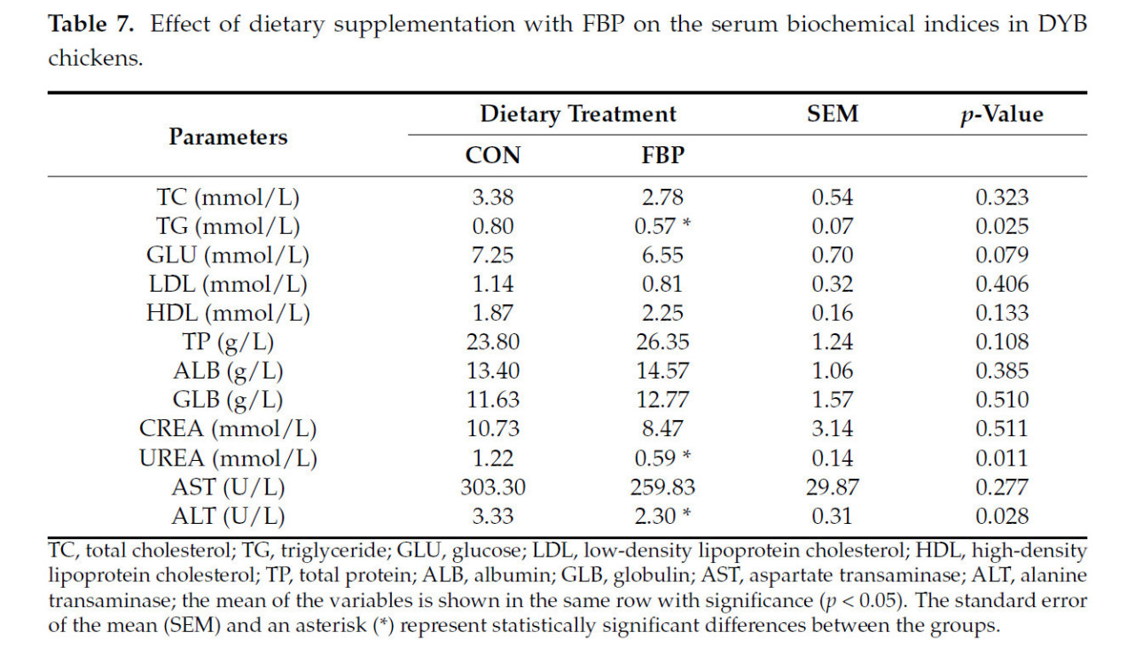 Таблица 7. Влияние диетической добавки ФБП на биохимические показатели сыворотки крови у цыплят DYB.