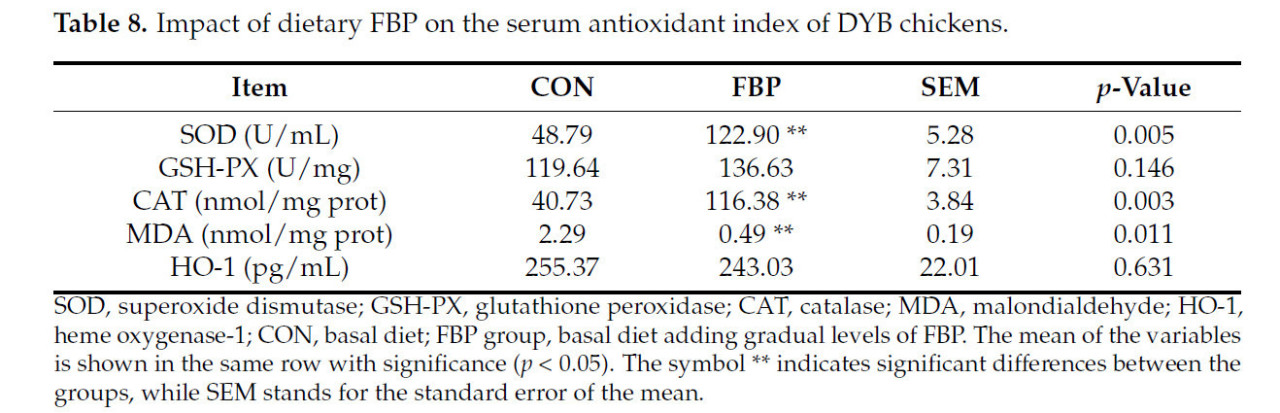 Данные, представленные в Таблице 8, показывают влияние ФБП на маркеры антиоксидантного статуса сыворотки. Активности CAT и SOD были значительно повышены по сравнению с контрольной группой (p < 0,01). Мы не наблюдали заметных различий в содержании GSH-PX между контрольной группой и группой ФБП. По сравнению с контрольной группой, группа ФБП показала значительное снижение (p = 0,01) уровней MDA.