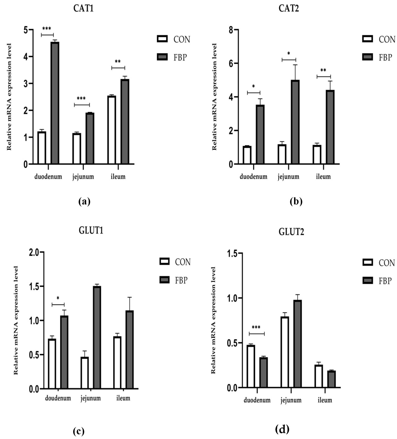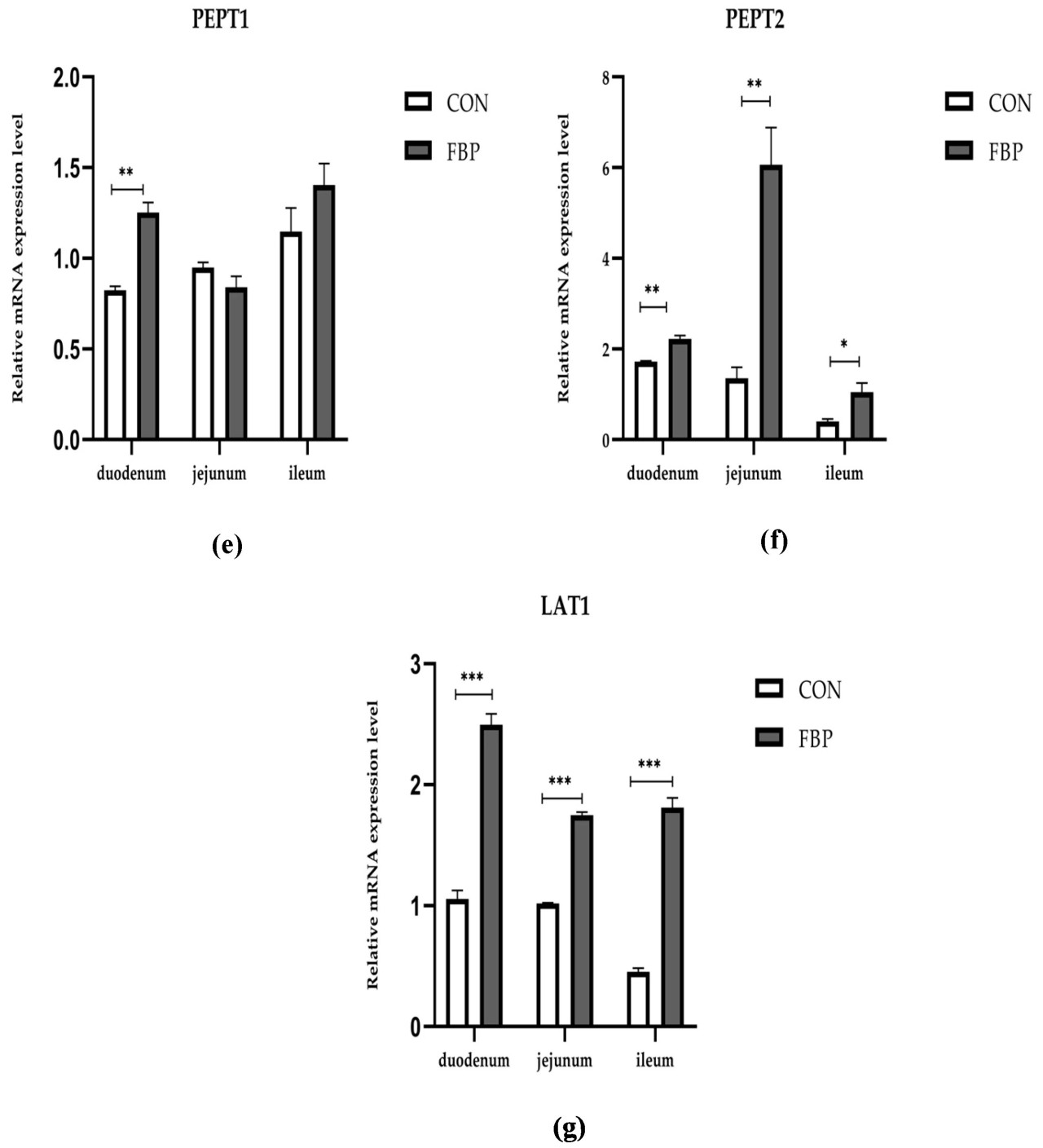 Рисунок 3 иллюстрирует исследование уровней экспрессии мРНК семи генов в трех основных отделах кишечника, в частности, в двенадцатиперстной, тощей и подвздошной кишках, после добавления в корм ФБП. Рацион с ФБП значительно повысил относительную экспрессию мРНК CAT1, CAT2, PepT2 и LAT1 в кишечном тракте птиц по сравнению с группой рациона CON (p < 0,05). Рацион с ФБП не оказал заметного влияния на другие исследованные гены, такие как GLUT1, GLUT2 и PepT1, по сравнению с контрольной группой. И наоборот, рацион с ФБП повысил относительный уровень экспрессии мРНК GLUT в тощей кишке.
