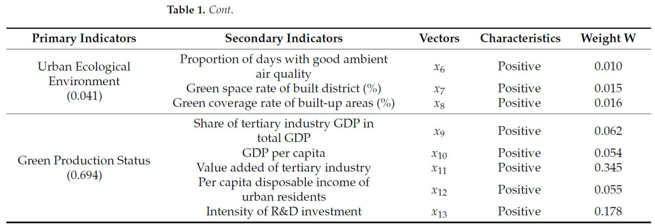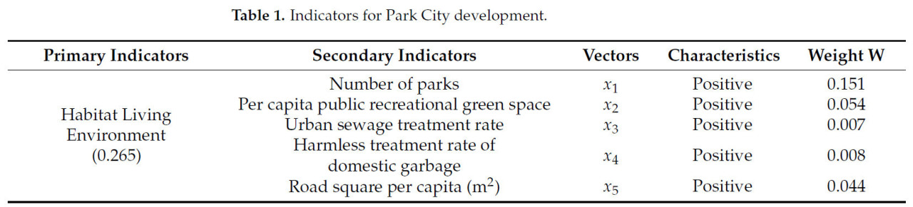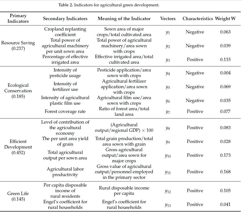 Выбор индикаторов исследования следует принципам доступности данных, научности и простоты. Выбор индикаторов опирается на некоторые существующие результаты исследований и сочетается с местными политическими документами «14-й пятилетки для строительства и развития паркового города Чэнду». Основываясь на коннотации паркового города, данное исследование выбирает три первичных индикатора: среда обитания, городская экологическая среда и состояние зеленого производства. Мы также выбрали 13 вторичных индикаторов для отражения уровня развития паркового города, таких как площадь зеленых насаждений парков на душу населения в застроенных районах и доля зеленых насаждений в застроенных районах [41,42], как показано в Таблице 1. Одновременно, основываясь на понимании коннотации зеленого развития сельского хозяйства, данное исследование строит 4 первичных индикатора и 13 вторичных индикаторов по измерениям ресурсосбережения, экологического сохранения, эффективного развития и зеленой жизни в качестве системы индикаторов для измерения уровня зеленого развития сельского хозяйства [43,44], как показано в Таблице 2.