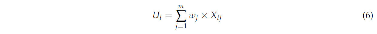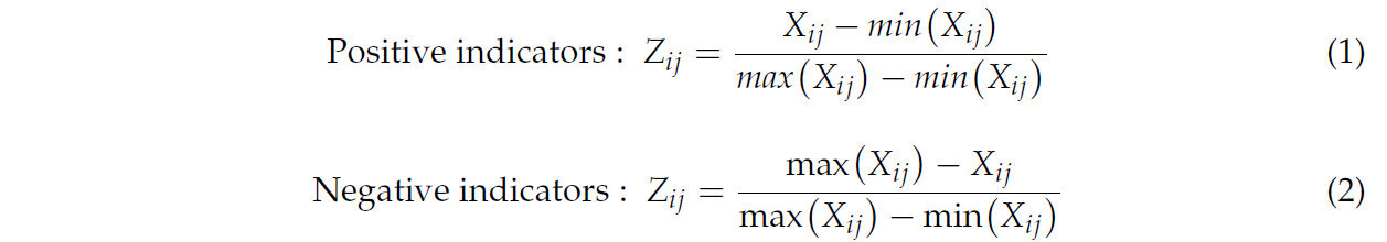 В уравнениях (1) и (2) i представляет год (i = 1, 2, ..., n), j представляет индикатор j (j = 1, 2, ..., m). X представляет значение индикатора, Z_ij представляет стандартизированное значение индикатора j, а max(X_ij) и min(X_ij) представляют максимальное и минимальное значения данных индикатора соответственно.