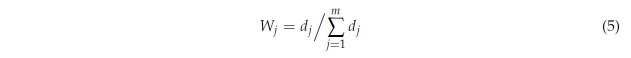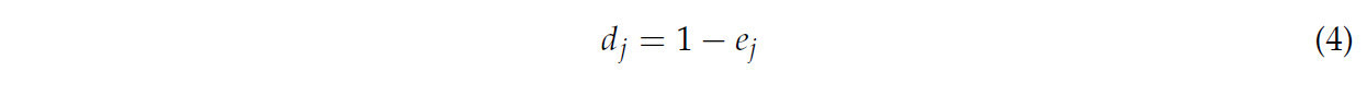 В уравнении (3) P_ij = X_ij / Σ_{i=1}^{n} X_ij обозначает долю индикатора j в i-м году для этого индикатора, где n — количество образцов. Поскольку полезность данных исследовательского индикатора зависит от разницы между информационной энтропией индикатора e_j и 1, коэффициент вариации рассчитывается, как показано в уравнении (4):