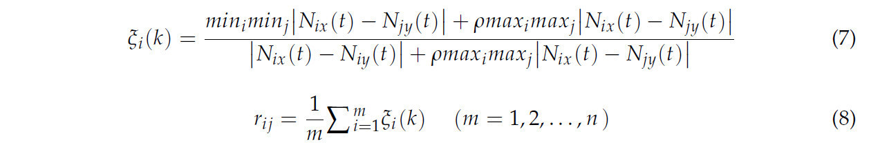 Анализ серой корреляции — это метод измерения степени корреляции различных факторов, основанный на степени сходства или различия тенденций между факторами. Мы можем охарактеризовать степень связи и эволюционную тенденцию между двумя системами зеленого развития сельского хозяйства и развития паркового города путем расчета коэффициентов серой корреляции между каждым индикатором в рамках систем оценки уровня зеленого развития сельского хозяйства и развития паркового города [46]. Это может помочь в исследовании временной взаимосвязи между зеленым развитием сельского хозяйства и развитием паркового города, особенно когда данные неполны или неопределенны. Этот метод количественно определяет степень корреляции между двумя переменными путем сравнения их моделей изменения во времени. Формула расчета коэффициента корреляции показана в уравнении (7), а формула расчета степени ассоциации показана в уравнении (8):