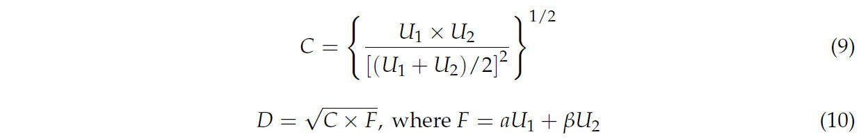 Концепция связанности происходит из физики. Степень связанности является важным индексом, отражающим степень взаимозависимости и взаимного влияния между системами или элементами. Степень связанности в основном используется для измерения синергетического эффекта между последовательными коэффициентами внутри двух или более систем или элементов, с целью выяснения их связанной взаимосвязи, а также общей согласованности [47]. Степень согласованности связи помогает измерить уровень согласованности между зеленым развитием сельского хозяйства и развитием паркового города, показывая их взаимное влияние на разных этапах развития. В частности, степень согласованности связи отражает степень выравнивания и общий уровень развития между двумя системами в течение заданного периода, предлагая более глубокое понимание взаимодействия между зеленым развитием сельского хозяйства и строительством паркового города. Чтобы дополнительно судить об уровне зеленого развития сельского хозяйства и развития паркового города в разные годы, мы можем построить модель степени согласованности связи, как показано в уравнениях (9) и (10):