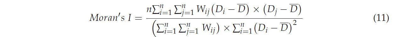 В уравнении (11) n представляет количество городов окружного значения; W_ij обозначает матрицу пространственных весов, отражающую пространственную или экономическую географию; D_i и D_j представляют степень согласованности связи регионов i и j соответственно; а i относится к городу окружного значения, соседнему с городом j. Как правило, индекс Морана I попадает в диапазон (-1, 1). Когда Moran's I > 0, это указывает на положительную пространственную автокорреляцию между индексом согласованности связи развития паркового города и зеленого развития сельского хозяйства. И наоборот, когда Moran's I < 0, это предполагает отрицательную пространственную автокорреляцию между индексом согласованности связи развития паркового города и зеленого развития сельского хозяйства.