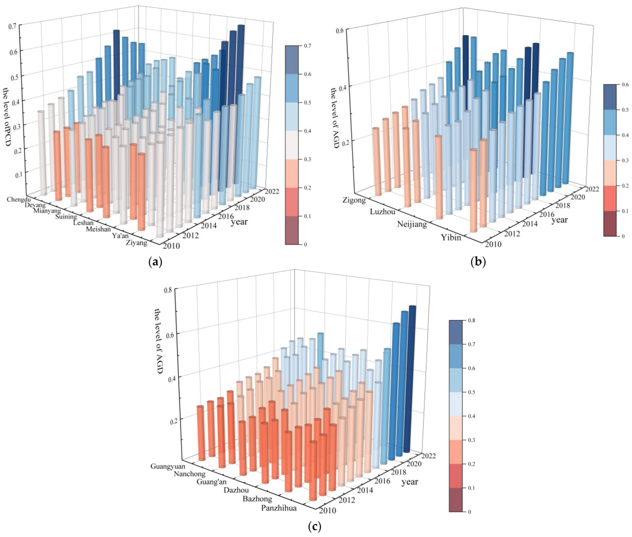 Рисунок 2. Комплексный уровень зеленого развития сельского хозяйства и изменения его подсистем в городах окружного значения провинции Сычуань с 2011 по 2022 год. (a) Уровень зеленого развития сельского хозяйства городов окружного значения в Экономической зоне Чэндуской равнины с 2011 по 2022 год; (b) Уровень зеленого развития сельского хозяйства городов окружного значения в Экономической зоне Южного Сычуаня с 2011 по 2022 год; (c) Уровень зеленого развития сельского хозяйства городов окружного значения в Экономической зоне Северо-Восточного Сычуаня и Паньчжихуа с 2011 по 2022 год.