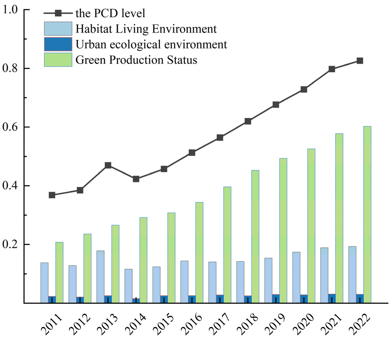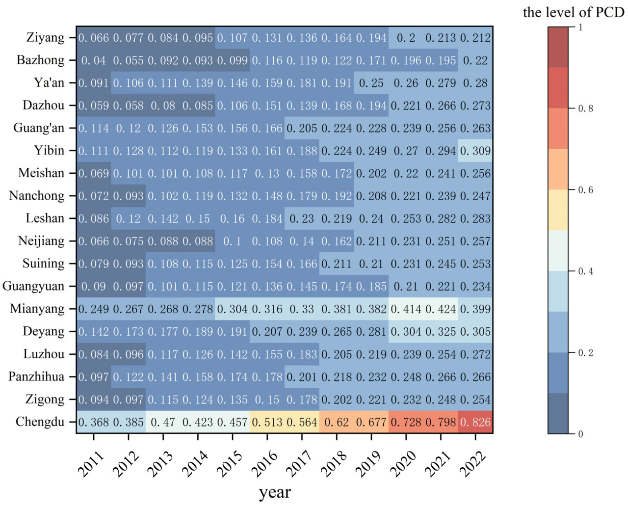 Рисунок 4. Комплексный уровень развития PCD в городах окружного значения провинции Сычуань с 2011 по 2022 год.