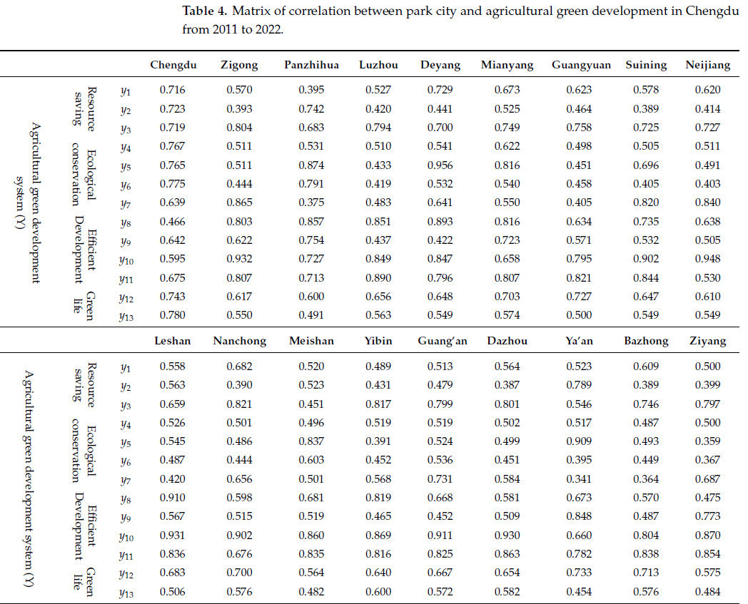 Таблица 4. Матрица корреляции между парковым городом и зеленым развитием сельского хозяйства в Чэнду с 2011 по 2022 год.