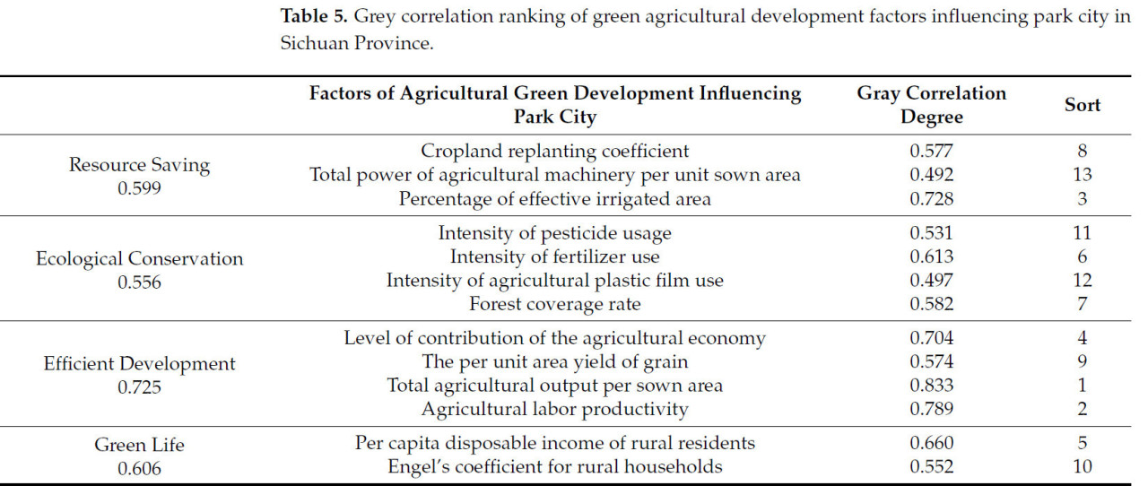 Таблица 5. Ранжирование серой корреляции факторов зеленого развития сельского хозяйства, влияющих на парковый город в провинции Сычуань.