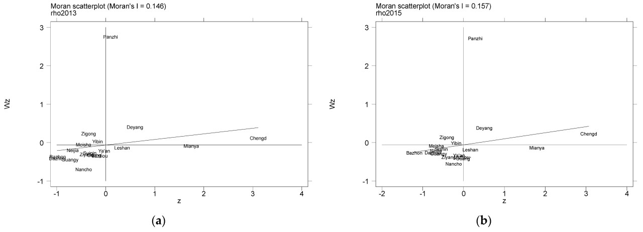 Результаты показывают, что, за исключением 2011 и 2018 годов, индекс Морана I степени согласованности связи городов окружного значения в Сычуани прошел тест на значимость на уровне 10%, что указывает на определенную степень пространственной кластеризации. Это предполагает, что степень согласованности связи зеленого развития сельского хозяйства и развития паркового города в регионе зависит от соседних регионов. Судя по величине индекса Морана I, коэффициенты Морана I степени связанности с 2012 по 2022 год все больше 0, что указывает на положительную пространственную корреляцию. С одной стороны, в аграрном секторе провинция Сычуань активно продвигала трансформацию к зеленому сельскому хозяйству, способствуя переходу к ресурсосберегающим и экологически чистым способам сельскохозяйственного производства, что постепенно снизило негативное воздействие традиционного сельского хозяйства на окружающую среду. Между тем, с точки зрения зеленого городского строительства, провинция Сычуань активно продвигает модель городского развития, ориентированную на экологическую цивилизацию, создавая пригодную для жизни и устойчивую форму «паркового города». Скоординированное развитие обоих секторов также способствовало позитивному взаимодействию и синергии между городскими и сельскохозяйственными системами. С другой стороны, провинция Сычуань ускорила строительство интегрированного городского и сельского планирования и региональной интеграции. Для содействия региональному сотрудничеству Сычуань внедрила ряд политик, и в некоторых регионах постепенно сформировалась благоприятная ситуация для скоординированного развития сельского хозяйства и городских районов, что повысило общую степень согласованности между регионами. Это сходно с результатами Гань и др. (2020), показывающими, что сокращение разрыва между городом и деревней способствует согласованному региональному развитию [52].
