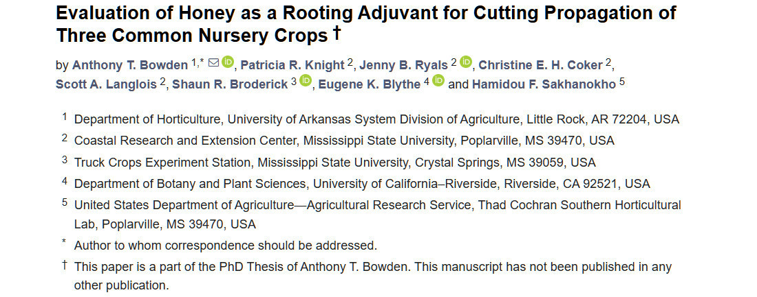 Перевод статьи «Evaluation of Honey as a Rooting Adjuvant for Cutting Propagation of Three Common Nursery Crops» авторов Bowden AT, Knight PR, Ryals JB, Coker CEH, Langlois SA, Broderick SR, Blythe EK, Sakhanokho HF., оригинал доступен по ссылке. Лицензия: CC BY. Изменения: переведено на русский язык