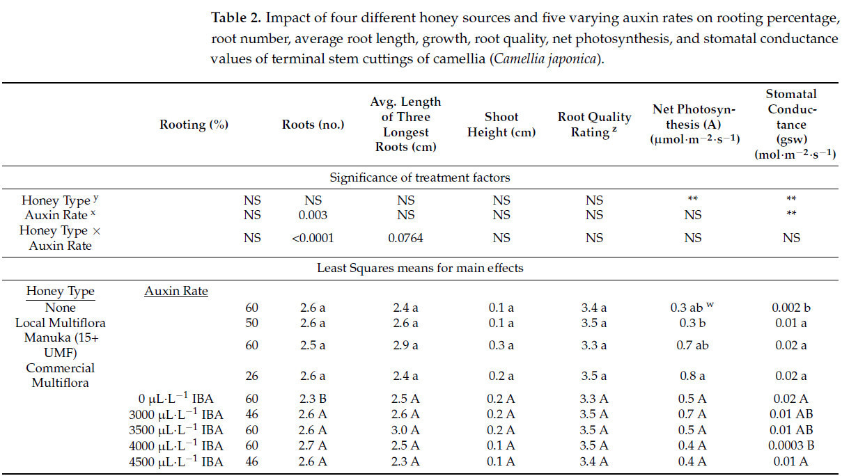 Для камелии использование любого типа меда привело к увеличению значений устьичной проводимости по сравнению с необработанным контролем. Напротив, использование коммерчески доступного разнотравного меда увеличило скорость чистого фотосинтеза по сравнению с местным разнотравным медом. Хотя этот результат отличается от результата Уолли (2009), его работа не включала камелию японскую, и для трудноукореняемых видов нередко существуют совершенно разные протоколы размножения.