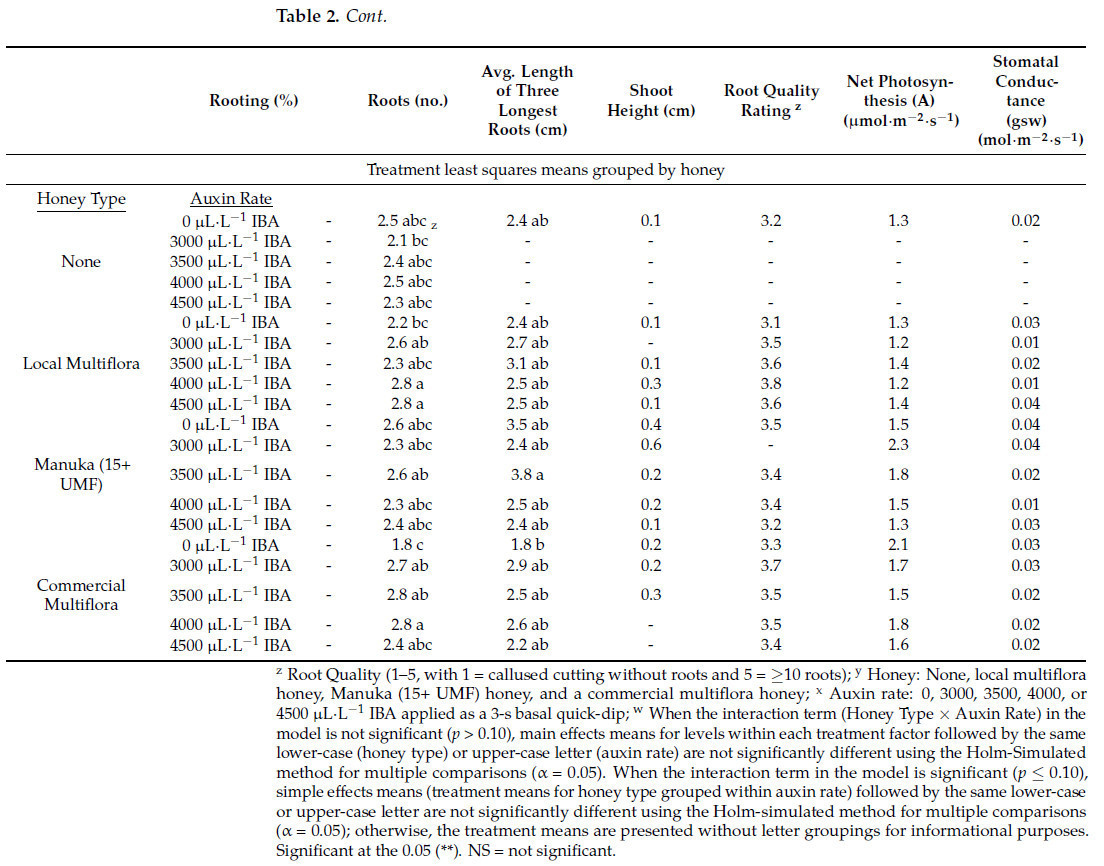 Процент укоренения камелии колебался от 26,7% до 60%, но ни тип меда, ни концентрация ауксина не повлияли на процент укоренения (Таблица 2). Также ни тип меда, ни концентрация ауксина не повлияли на среднюю длину трех самых длинных корней, высоту побега или оценки качества корней (Таблица 2). Наблюдалось взаимодействие между основными эффектами концентрации ауксина и типа меда для количества корней (Таблица 2). Черенки, обработанные растворами местного или разнотравного меда в сочетании с 4000 мкл∙л−1 ИМК, и раствором местного разнотравного меда с 4500 мкл∙л−1 ИМК, привели к большему количеству корней, чем черенки, обмакнутые в местный разнотравный мед или коммерчески доступный раствор разнотравного меда без ауксина, или обработки с 3000 мкл∙л−1 ИМК без меда (Таблица 2). Тип меда значительно повлиял на скорость чистого фотосинтеза (A) (Таблица 2). Обработка черенков коммерческим разнотравным медом привела к более высокой скорости фотосинтеза, чем обработка черенков местным разнотравным медом. Концентрация ауксина и тип меда значительно повлияли на значения устьичной проводимости (Таблица 2). Черенки, обработанные любым типом меда (коммерческий разнотравный, манука или местный разнотравный), имели более высокие значения устьичной проводимости, чем черенки в контрольной группе. Что касается концентрации ауксина, черенки, не получавшие ауксин, и черенки, получавшие 4500 мкл∙л−1 ИМК, показали более высокие значения газообмена устьиц, чем черенки, обработанные 4000 мкл∙л−1 ИМК.