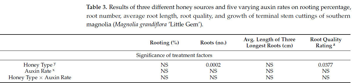 Таблица 3. Результаты влияния трех различных источников меда и пяти различных концентраций ауксина на процент укоренения, количество корней, среднюю длину корней, качество корней и рост верхушечных стеблевых черенков магнолии крупноцветковой (Magnolia grandiflora 'Little Gem').