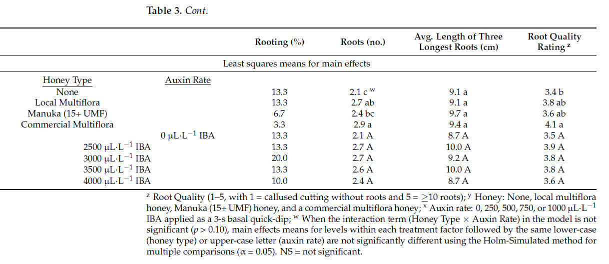 Хотя использование одного только меда не улучшило укоренение по большинству измеряемых параметров, положительное взаимодействие наблюдалось при комбинировании меда манука с 500 мкл∙л−1 ИМК в отношении средней длины трех самых длинных корней и роста побегов у черенков миниатюрной плетистой розы Red Cascade™. Это предполагает синергетическую связь между медом и ауксином, которая требует дальнейшего изучения, в частности в отношении скорости инициации корней. Антимикробные эффекты меда также могут положительно влиять на укоренение видов, восприимчивых к патогенам во время размножения, хотя не было выявлено явного преимущества для размножения большого количества легкоукореняемых видов, таких как Red Cascade™.