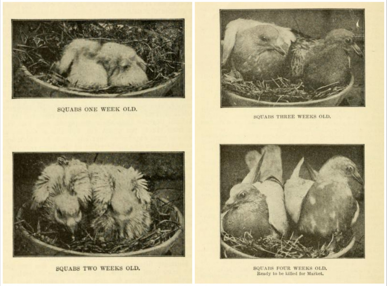 Голубь, однако, — это птенцовая птица, то есть птенцы при рождении беспомощны. Хотя возможно, что научные методы со временем превратят птенцов в продукт массового производства мяса, эта фундаментальная особенность развития голубя создает сложности. «Человеческий младенец — птенцовая птица, — говорит Барвик. — То же самое и с голубем… Он рождается с закрытыми глазами , а это значит, что родители должны отрыгивать ему корм». Поскольку птенцы беспомощны, семейные группы должны оставаться относительно целыми, и птиц нельзя насильно откармливать. Вначале птенцы голубей не едят разбросанный птичий корм, а полагаются на так называемое «голубиное молоко», которое они выпивают из пасти матери или отца . Именно поэтому в среднем пара голубей производит только двух птенцов каждые 45 дней. Напротив, одна курица в искусственно освещенном помещении может производить до одного яйца в день , из которых, если их осеменить и высиживать, могут вырасти новые цыплята.