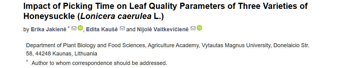 Jakienė E, Kaušė E, Vaitkevičienė N. Impact of Picking Time on Leaf Quality Parameters of Three Varieties of Honeysuckle (Lonicera caerulea L.). Agriculture. 2025; 15(3):257. https://doi.org/10.3390/agriculture15030257