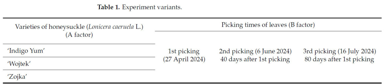 Был проведен двухфакторный полевой эксперимент с тремя сортами съедобной жимолости - 'Indigo Yum', 'Wojtek' и 'Zojka' (фактор А) - и тремя различными сроками сбора листьев (фактор В) - 1-й сбор (27 апреля), 2-й сбор (через 40 дней после 1-го сбора), 3-й сбор (через 80 дней после 1-го сбора) (Таблица 1). Делянки полевого опыта были расположены рендомизированно с четырьмя повторностями, и каждая опытная делянка содержала пять кустов. Расстояния посадки для съедобной жимолости составляли 4,0 м между рядами и 0,7 м между кустами. Полевой эксперимент был проведен в 2024 году на ферме по выращиванию съедобной жимолости в Алитусском районе, Литва (54°29′44,7″ с.ш. 24°00′14,5″ в.д.).