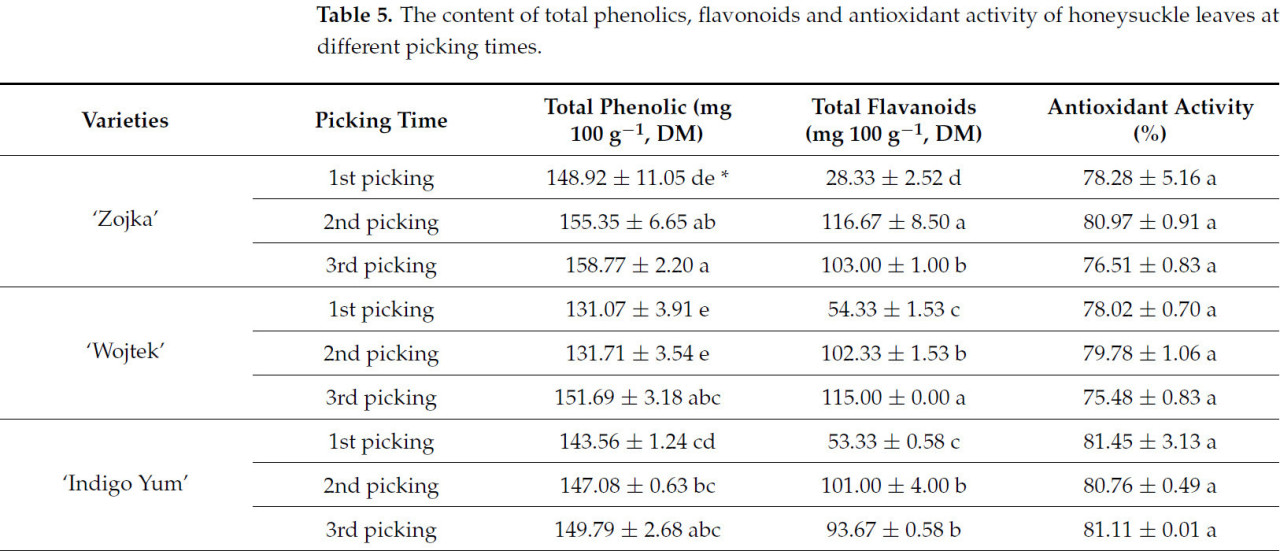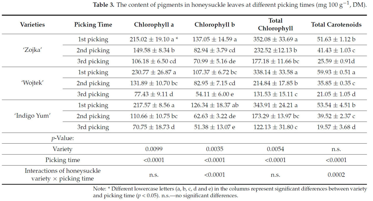 Содержание протестированных соединений также значительно различалось между сортами жимолости. Листья первого сбора сорта 'Wojtek' имели самое высокое содержание белка, N, P и суммарных каротиноидов, в то время как листья третьего сбора имели самое высокое содержание клетчатки и золы. Листья третьего сбора сорта 'Indigo Yum' содержали самые высокие уровни Ca и Mg. Самое высокое содержание суммы флавоноидов было обнаружено в листьях второго сбора 'Zojka' и листьях третьего сбора 'Wojtek'.