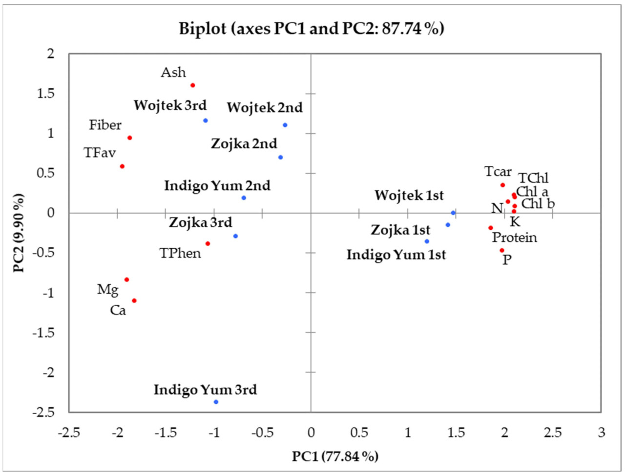 При первом сборе данные для листьев жимолости всех изученных сортов располагались на противоположной стороне по сравнению с данными второго и третьего сборов. Это указывает на то, что молодые листья (первый сбор) всех протестированных сортов содержали самые высокие количества N, P, K, хлорофилла a, хлорофилла b, общего хлорофилла и суммарных каротиноидов и самые низкие количества Ca, Mg, суммы флавоноидов и клетчатки.