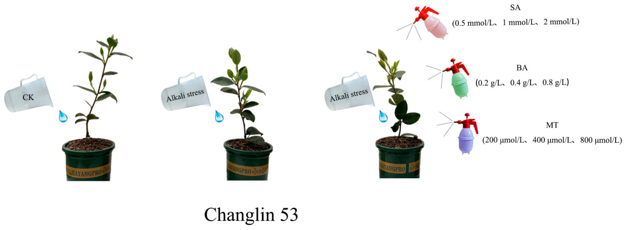 В этом эксперименте для всего 11 групп обработки в каждой группе обработки было отобрано 30 здоровых саженцев с одинаковым ростом и развитием и без вредителей и болезней, которые подвергались корневому поливу для создания щелочного стресса. Значение pH стресса составляло 9,5. pH измеряли с помощью электронного pH-метра (PHS-3C). Щелочной раствор (контрольный полив дистиллированной водой) готовили из бикарбоната натрия и карбоната натрия в молярном соотношении 2:1. pH стрессового раствора калибровали 1 моль/л раствором гидроксида натрия. После 7 дней воздействия стресса на три сорта C. oleifera начиная с 8-го дня в течение 3 дней проводили непрерывное опрыскивание ЭБ. 11 групп обработки были следующими: (1) CK: нормальная вода без опрыскивания; (2) XP: щелочной стресс; (3) XP + 0,5 ммоль/л СК (СК1); (4) XP + 1 ммоль/л СК (СК2); (5) XP + 2 ммоль/л СК (СК3); (6) XP + 0,2 г/л БА (БА1); (7) XP + 0,4 г/л БА (БА2); (8) XP + 0,8 г/л БА (БА3); (9) XP + 200 мкмоль/л МТ (МТ1); (10) XP + 400 мкмоль/л МТ (МТ2); и (11) XP + 800 мкмоль/л МТ (МТ3) (подробности см. на рисунке 1). Отбор проб был разделен на два периода: 7 дней равномерного щелочного стресса, и образцы отбирали на 7-й и 15-й дни после 3 дней непрерывного опрыскивания ЭБ в разных концентрациях. При опрыскивании ЭБ желательно покрывать каплями переднюю и заднюю стороны листьев C. oleifera, но не допускать стекания вниз.