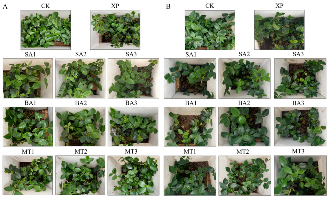 В условиях щелочного стресса применение различных типов и концентраций ЭБ на саженцах C. oleifera привело к различным фенотипическим изменениям. Как показано на рисунке 2A, на 7-й день применения ЭБ в условиях щелочного стресса фенотип группы CK отличался от фенотипа 10 групп обработки, что в основном проявлялось опадением листьев и пожелтением краев листьев. По сравнению с группой CK, пожелтение и опадение листьев были более очевидны в группах обработки XP, СК3, БА1, БА3 и МТ1. На 7-й день опрыскивания ЭБ в условиях щелочного стресса пожелтение и скручивание листьев были более заметны в остальных 10 группах обработки, особенно в группах XP, СК1, СК3, БА1, БА3, МТ1 и МТ3 (Рисунок 2B). По фенотипу C. oleifera можно сделать вывод, что с увеличением времени применения ЭБ в рамках одного периода щелочного стресса смягчающий эффект на C. oleifera постепенно снижается.