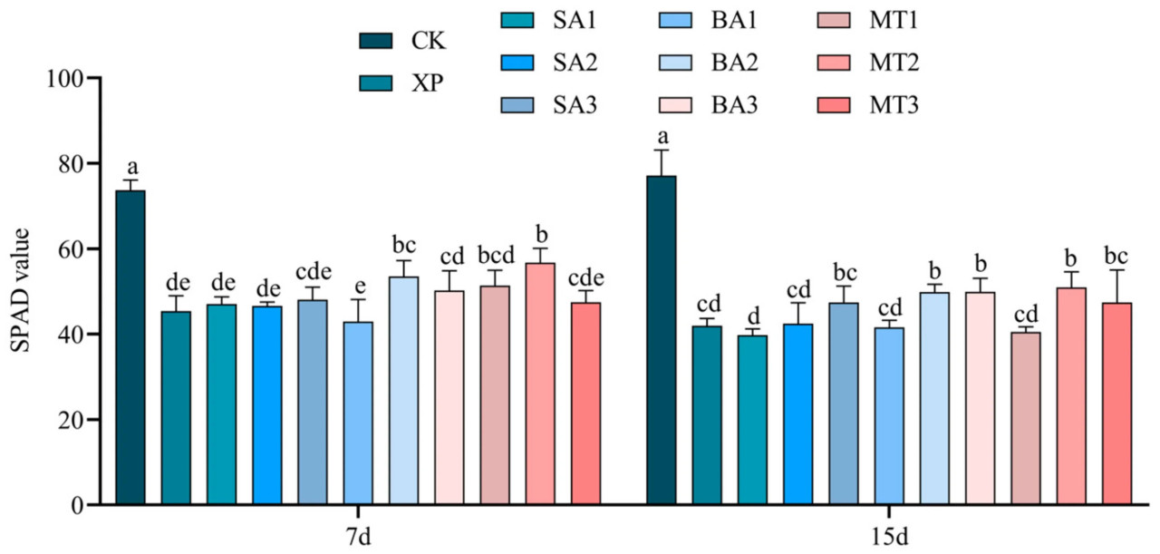 SPAD показывает/указывает на степень зелености растений и относительное значение содержания хлорофилла в листьях. Как показано на рисунке 3, наблюдались различия в SPAD саженцев C. oleifera на 7-й и 15-й дни применения ЭБ в условиях щелочного стресса. Было обнаружено, что SPAD в группе CK на 7-й день значительно/существенно/заметно отличался от такового в 10 группах обработки. Самый низкий SPAD был в группе БА1, но SPAD в группе МТ2 уступал только группе CK. На 15-й день наблюдались значительные/существенные/заметные различия в SPAD между контрольной группой и остальными 10 группами обработки, среди которых SPAD в группе обработки МТ1 был самым низким из 11 групп обработки, но значение SPAD в группах обработки БА2, БА3 и МТ2 также уступало только группе CK.
