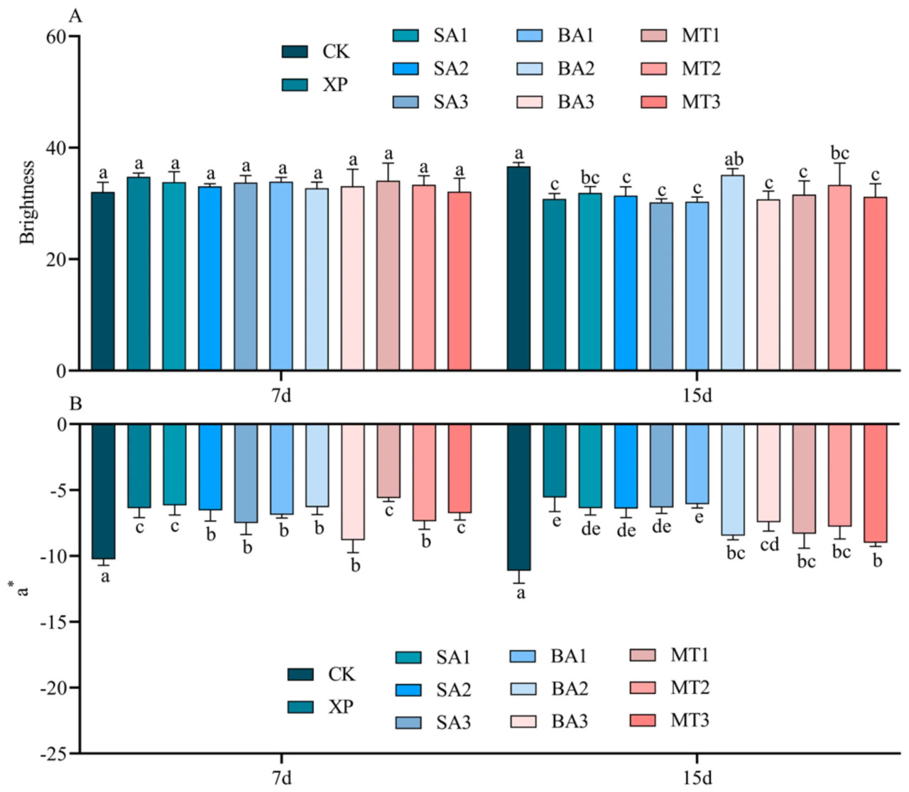 Как видно из рисунка 4A, не было различий в яркости листьев C. oleifera во всех группах обработки на 7-й день после применения ЭБ, значения варьировались от 32,06 до 34,79. За исключением группы обработки БА2, на 15-й день после применения ЭБ наблюдались различия между остальными 9 группами обработки и группой CK. Однако между девятью группами обработки различий не было, значения варьировались от 30,31 до 36,65. a отражает степень желтизны-зелености листьев C. oleifera. Чем выше абсолютное значение, тем зеленее листья; чем ниже абсолютное значение данных, тем желтее листья. Как показано на рисунке 4B, на 7-й день опрыскивания ЭБ в условиях щелочного стресса 10 групп обработки показали значительные/существенные/заметные различия по сравнению с группой CK. На 15-й день опрыскивания ЭБ в условиях щелочного стресса группа обработки XP и группа обработки БА1 имели наихудшую степень зелености листьев.