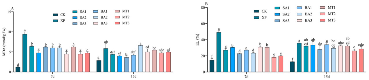 Чрезмерное накопление АФК будет атаковать клеточную мембрану растений, и эта атака на мембрану вызовет чрезмерное накопление МДА, что увеличит проницаемость мембраны и приведет к экзосмосу электролитов. На 7-й день опрыскивания ЭБ в условиях щелочного стресса содержание МДА было значительно/существенно/заметно повышено во всех группах обработки, кроме группы CK, особенно в группе обработки XP, но группы обработки СК2, БА3, МТ2 и МТ3 снизили содержание МДА. На 15-й день опрыскивания ЭБ в условиях щелочного стресса содержание МДА было значительно/существенно/заметно выше в группах обработки XP и БА2, чем в других группах обработки, и различий между этими двумя группами не было (Рисунок 5A). Как показано на рисунке 5B, на 7-й день опрыскивания ЭБ в условиях щелочного стресса ЭУ в группе обработки XP самая высокая среди всех групп обработки, что указывает/свидетельствует о том, что повреждение клеточной мембраны здесь наибольшее среди всех. Кроме того/дальше, было обнаружено, что группы обработки СК3, БА3, МТ2 и МТ3 имели значительные/существенные/заметные различия по сравнению с группой обработки XP, и эти четыре группы обработки могли эффективно/действенно/успешно снизить электропроводность. На 15-й день опрыскивания ЭБ в условиях щелочного стресса не было различий между группой XP и группами обработки ЭБ СК1, СК2, БА1, БА3 и МТ1, а ЭУ в группе обработки ЭС МТ2 была самой низкой, уступая только группе CK. Согласно вышеприведенным результатам, можно предварительно заключить, что с увеличением времени применения ЭБ смягчающий эффект ЭБ в отношении щелочного стресса также ослабевает. Поэтому необходимо обращать внимание на эффективность времени опрыскивания при условии, что различные типы ЭБ могут ослаблять стресс.