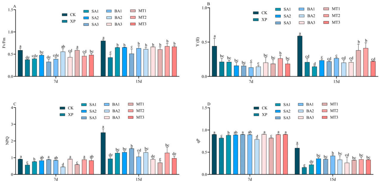 Реакции Fv/Fm, Y(II), NPQ и qP саженцев C. oleifera в условиях щелочного стресса на различные типы и концентрации ЭБ (СК, БА и МТ) показаны на рисунке 7. По сравнению с группой CK, Y (II), qP, Fv/Fm и NPQ в целом снижались на 7 и 15 дни при опрыскивании ЭБ в условиях щелочного стресса. На 7-й день применения ЭБ Fv/Fm в группе CK не имела значительной/существенной/заметной разницы с группами БА2 и МТ1. Однако Fv/Fm в группах обработки CK и МТ1 значительно/существенно/заметно отличались от таковых в остальных восьми группах обработки, за исключением группы обработки БА2 (Рисунок 7A). На 15-й день опрыскивания ЭБ в условиях щелочного стресса Fv/Fm группы XP была значительно/существенно/заметно ниже, чем в группе CK, на 46,69%. Как показано на рисунке 7B, наблюдались значительные/существенные/заметные различия между группой CK и остальными 10 группами обработки на 7-й день применения ЭБ. На 15-й день опрыскивания ЭБ в условиях щелочного стресса наблюдались различия между группами обработки МТ1 и МТ2 и остальными восемью группами обработки, а Y(II) значительно/существенно/заметно увеличилась. Как показано на рисунке 7C, NPQ группы CK отличался от других 10 групп обработки на 15-й день применения ЭБ. Как видно на рисунке 7D, не было значительной/существенной/заметной разницы в qP между группой обработки XP и остальными 10 группами обработки на 7-й и 15-й дни опрыскивания ЭБ в условиях щелочного стресса, за исключением группы CK (p < 0,05).