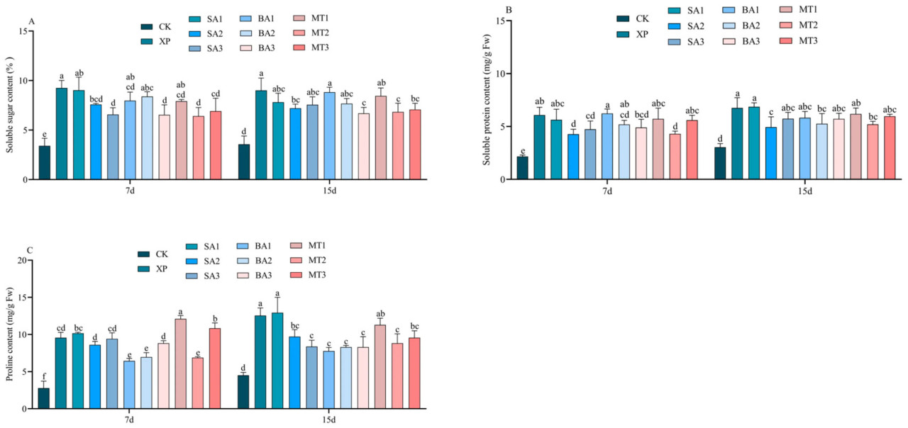 Накопление Pro в растениях, особенно в листьях, является физиологическим индикатором устойчивости растений; следовательно, измерение содержания Pro может служить физиологическим индикатором для селекции на щелочеустойчивость. Как показано на рисунке 8C, за исключением группы CK, содержание Pro в остальных 10 группах обработки увеличилось на 7-й и 15-й дни опрыскивания ЭБ в условиях щелочного стресса, особенно в группе обработки XP. На 7-й день опрыскивания ЭБ в условиях щелочного стресса содержание Pro в группах обработки БА1, БА2 и МТ2 снизилось в условиях щелочного стресса, но не было значительной/существенной/заметной разницы между тремя группами обработки. На 15-й день опрыскивания ЭБ в условиях щелочного стресса группы обработки СК3, БА1, БА2, БА3 и МТ2 показали различия и снижение содержания Pro по сравнению с XP. Кроме того, не было разницы между группами обработки XP, СК1 и МТ1 (Рисунок 7C). В целом, растения, опрысканные ЭБ в условиях щелочного стресса, могут координировать осмос, регулировать баланс веществ и в некоторой степени ослаблять повреждения, вызванные этим стрессом.