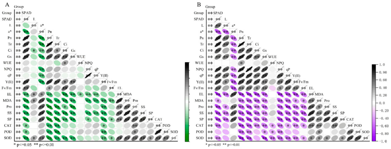 Чтобы лучше понять взаимосвязи между группами обработки, SPAD, параметрами цвета, фотосинтетическими параметрами, электропроводностью, содержанием МДА, осморегулирующими веществами, параметрами флуоресценции хлорофилла и антиоксидантными ферментами на 7-й и 15-й дни опрыскивания ЭБ в условиях щелочного стресса, был проведен корреляционный анализ (Рисунок 10A, B). Корреляционный анализ на 7-й день опрыскивания ЭБ в условиях одинакового щелочного стресса показал, что SPAD положительно коррелировал с Pn, Gs, Y(II), Tr, Fv/Fm и Ci, а Pn был значительно/существенно/заметно положительно коррелирован с Tr, Ci, Gs и Y(II) (p < 0,01). Однако Pn отрицательно коррелировал с ЭУ, МДА, Pro, РС, РБ, КАТ, ПО и СОД (p < 0,01). ЭУ положительно коррелировала с МДА, Pro, РС и РБ (p < 0,01). Аналогично, на 15-й день опрыскивания ЭБ в условиях щелочного стресса корреляционный анализ показал, что SPAD положительно коррелировал с Gs, Tr, Ci, Pn, NPQ, qP, Y(II), Fv/Fm и NPQ (p < 0,01). Pn положительно коррелировал с Gs, Tr, Ci, WUE, NPQ, qP, Y(II) и Fv/Fm (p < 0,01). Кроме того, ЭУ положительно коррелировала с МДА, Pro, РС, РБ и КАТ.