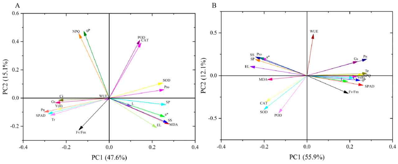 Анализ главных компонент (PCA) был проведен для 20 показателей из 11 различных групп обработки. Результаты показали, что Pn, SPAD, Tr, Gs, Y(II), NPQ, МДА, РС, a и РБ были отобраны в качестве основных показателей на 7-й день опрыскивания ЭБ по результатам PCA (Рисунок 11A). На 15-й день опрыскивания ЭБ два показателя с малыми коэффициентами — ПО и WUE — были исключены из результатов PCA, а остальные показатели использовались в качестве основных (Рисунок 11B).