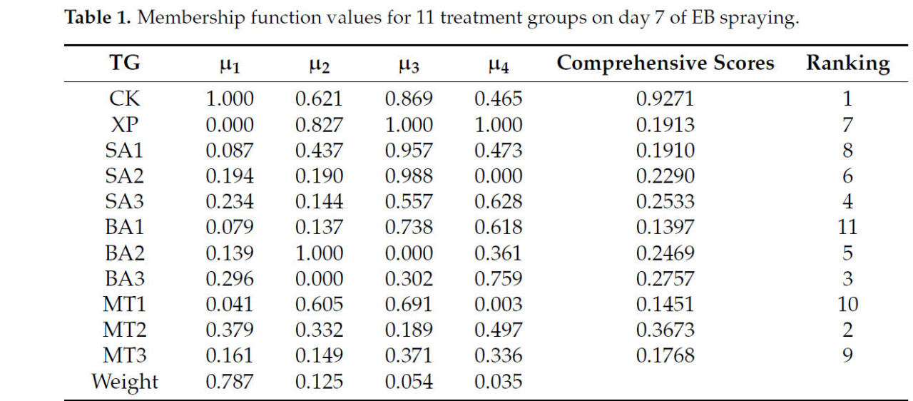 Таблица 1. Значения функции принадлежности для 11 групп обработки на 7-й день опрыскивания ЭБ.