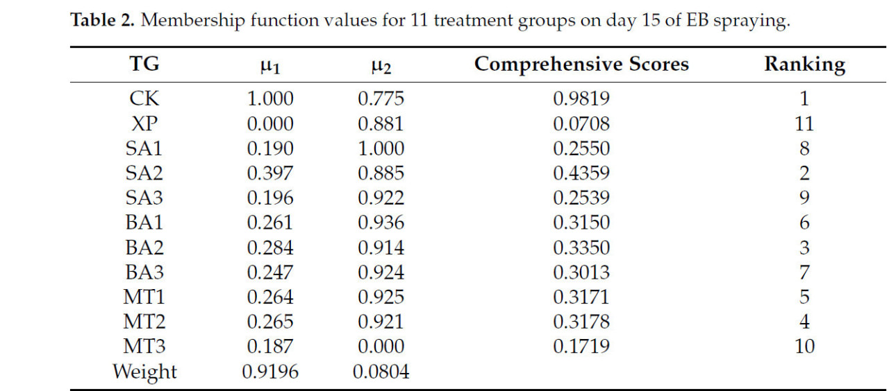Таблица 2. Значения функции принадлежности для 11 групп обработки на 15-й день опрыскивания ЭБ.