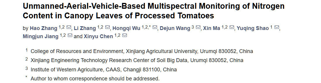 Zhang H, Zhang L, Wu H, Wang D, Ma X, Shao Y, Jiang M, Chen X. Unmanned-Aerial-Vehicle-Based Multispectral Monitoring of Nitrogen Content in Canopy Leaves of Processed Tomatoes. Agriculture. 2025; 15(3):309. https://doi.org/10.3390/agriculture15030309