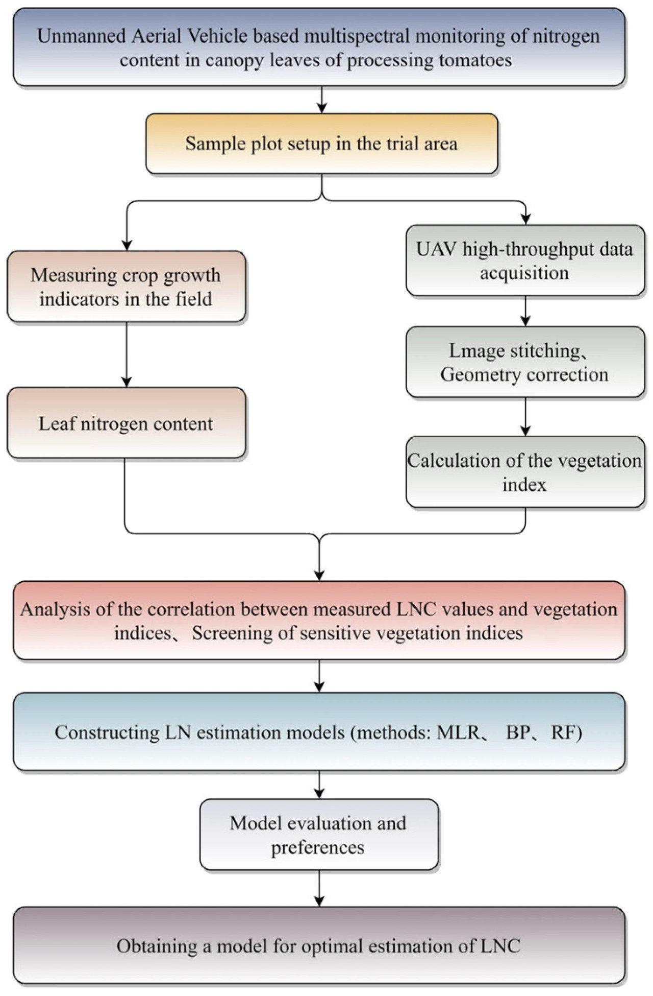 Чтобы восполнить эти пробелы, данное исследование интегрирует наземные обследования с методами дистанционного зондирования с БПЛА для систематического мониторинга САЛ технических томатов, как показано на Рисунке 1. Цели этого исследования тройны: (1) объяснить характеристики динамических изменений САЛ технических томатов на разных стадиях роста; (2) исследовать прогностическую способность вегетационных индексов в сочетании с моделями RF, BP и МЛР на протяжении всего жизненного цикла технических томатов; и (3) определить оптимальную стратегию мониторинга САЛ в течение полного жизненного цикла технических томатов в условиях различного растительного покрова путем сравнительного анализа моделей оценки содержания азота в листьях, построенных с использованием одной переменной по сравнению с несколькими переменными.