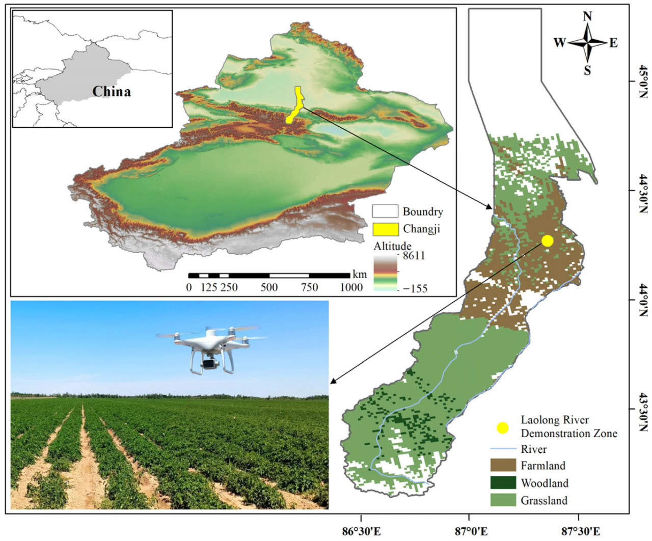 Район исследований расположен в Демонстрационном парке современного сельского хозяйства Национального научно-технического сельскохозяйственного парка в Чанцзи-Хуэйском автономном округе Синьцзян-Уйгурского автономного района, конкретно в районе Лаолунхэ города Чанцзи, который находится в северных предгорьях Тянь-Шаня на высоте около 490 м над уровнем моря, как показано на Рисунке 2. Расположенный на северных склонах Тянь-Шаня, на высоте приблизительно 490 м, этот регион отличается преимущественно засушливым климатом, получая всего 190 мм осадков в год. Среднегодовая температура составляет 6,8 °C, с впечатляющим количеством солнечных часов — 2700 в год. Благодаря обильным водным ресурсам, равнинному рельефу и плодородным почвам этот район стал ведущим центром переработки томатов в Синьцзяне. Он занимает значительное положение, обладая комплексной цепочкой поставок, охватывающей всю томатную индустрию. Занимая 41% площади возделывания томатов в регионе, здесь расположены 25 предприятий по переработке томатной продукции, включая одно, признанное национальным лидером. На эти предприятия приходится 35% перерабатывающих мощностей региона, а стоимость цепочки производства, по прогнозам, превысит 3 млрд юаней [12]. Таким образом, это, несомненно, идеальное место для проведения исследований по переработке томатов.
