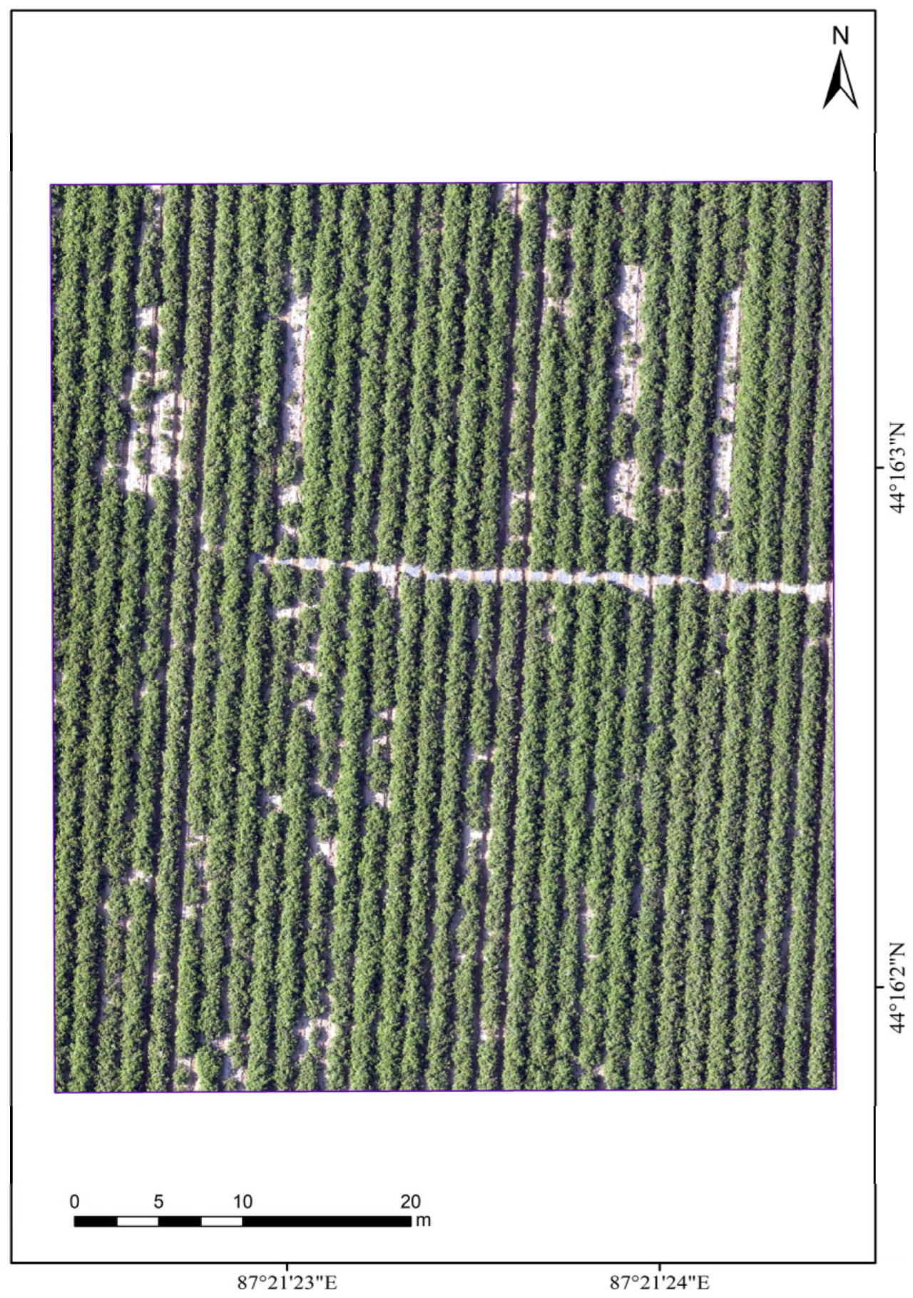Общая ширина экспериментального участка составляла 200 м, использовалась двухрядная грядковая система посадки. Расстояние между рядами на каждой гряде составляло 0,3 м, интервал между грядами — 1,5 м, растения высаживались на расстоянии 0,2 м друг от друга на глубину от 0,01 до 0,02 м. Эксперимент включал девять обработок, каждая из которых повторялась на трех грядах, каждая гряда длиной 760 м, что в сумме составило 27 отдельных делянок. Участок размером 210 м в длину и 120 м в ширину был выделен как исследовательская зона, где одновременно проводились дистанционное зондирование с дрона и ручные наземные обследования.