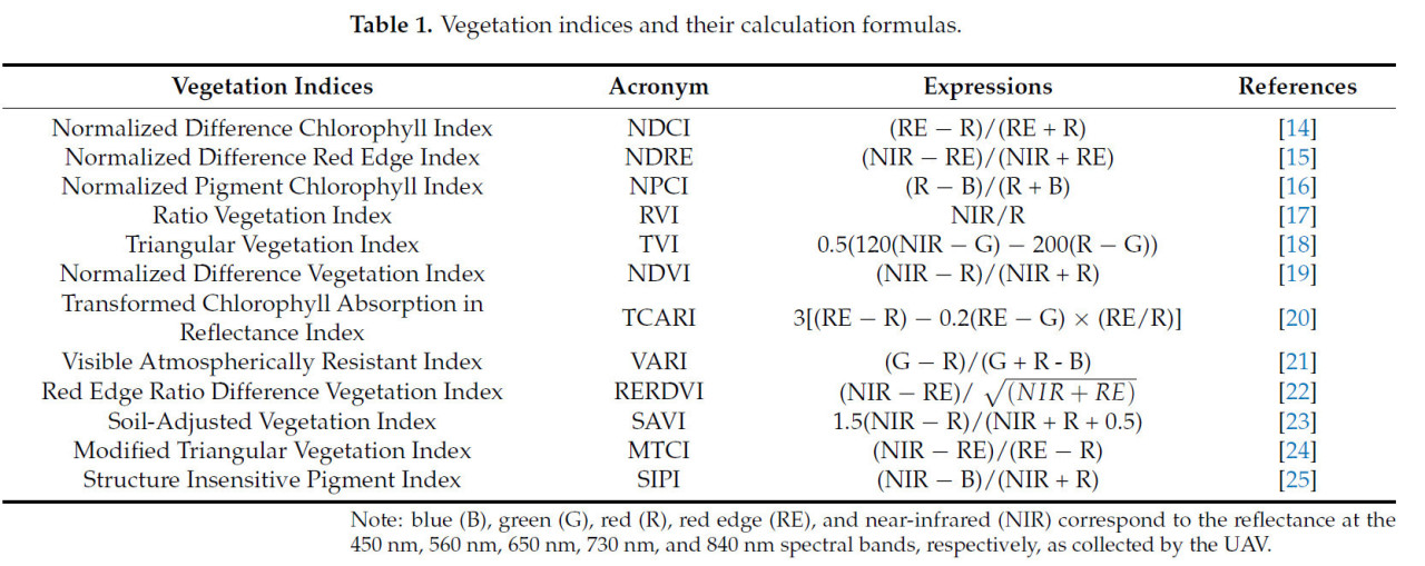 Вегетационный индекс (VI) — это количественный показатель, используемый для оценки и мониторинга роста, здоровья и степени покрытия растительности с помощью технологии дистанционного зондирования. Он формируется на основе спектральных характеристик растительности, используя отношение или линейную комбинацию отражения от двух или более различных спектральных каналов. VI важен для мониторинга различных характеристик растительности, таких как оценка физических параметров сельскохозяйственных культур, анализ землепользования и растительного покрова, а также поддержка климатических моделей и экологических симуляций. В этом исследовании, основываясь на предыдущих результатах исследований и соответствующей литературе, мы отобрали двенадцать вегетационных индексов, тесно коррелирующих с САЛ, для повышения точности мониторинга содержания азота в листьях сельскохозяйственных культур, как подробно описано в Таблице 1.