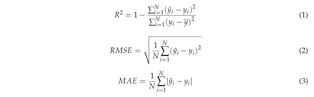 В этом исследовании в качестве показателей для оценки точности модели использовались коэффициент детерминации (R²), среднеквадратичная ошибка (RMSE) и средняя абсолютная ошибка (MAE). Показатель R² используется для оценки степени соответствия между наблюдаемыми значениями и прогнозами модели [26]. RMSE, чувствительная к выбросам, дает общую меру ошибки прогноза. Напротив, MAE обеспечивает прямое указание на среднюю величину ошибки, будучи менее подверженной влиянию выбросов, и оба показателя могут использоваться для оценки отклонений между наблюдаемыми значениями и прогнозами модели [27]. Более высокие значения R² и более низкие значения RMSE и MAE указывают на лучшее качество подгонки, отражая более высокую точность оценки и стабильность модели. Соответствующие формулы следующие:
