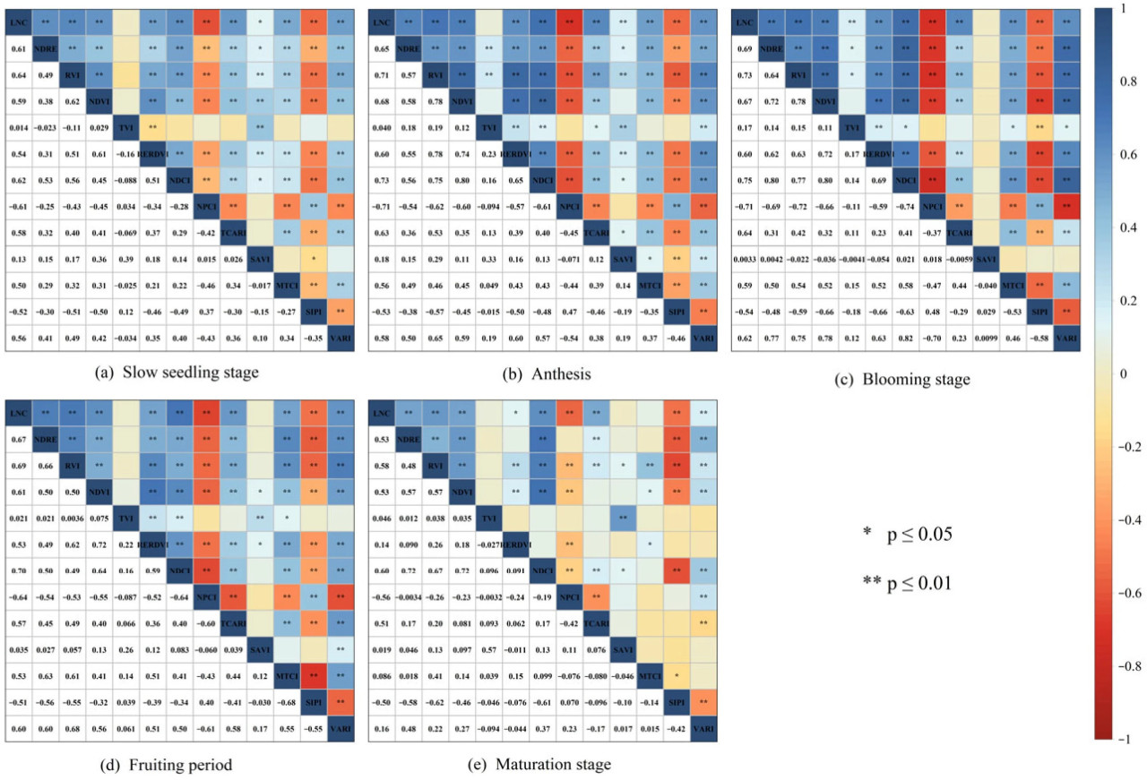 Был проведен корреляционный анализ Пирсона между спектральными переменными и измеренными значениями САЛ технических томатов на пяти стадиях роста, как показано на Рисунке 5. Среди этих стадий период полного цветения показал наиболее высокую корреляцию спектральных индексов с САЛ на уровне значимости 0,01, с абсолютными значениями от 0,54 до 0,76. Примечательно, что NDCI показал самую сильную корреляцию — 0,75. На стадиях начала цветения и завязывания плодов NDCI также продемонстрировал более высокие корреляции на уровне 0,01 со значениями 0,73 и 0,70 соответственно. На стадии укоренения рассады RVI показал заметную корреляцию 0,64 на уровне 0,01. И наоборот, на стадии созревания большинство спектральных индексов, за исключением MTCI, TVI и SAVI, достигли уровней значимости, при этом NDCI снова показал самую высокую корреляцию — 0,60. В целом, большинство спектральных индексов показали значимые корреляции с САЛ на стадиях укоренения рассады и начала цветения (p < 0,01). Однако на стадии созревания, хотя некоторые индексы сохранили значимость, такие как VARI с корреляцией 0,16, общая сила корреляции заметно уменьшилась.