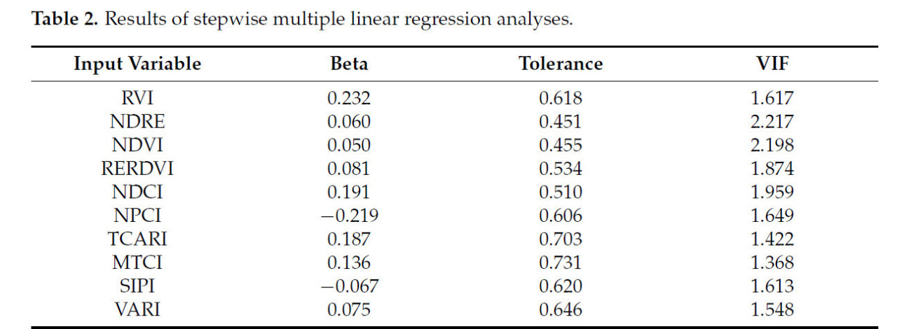 Чтобы снизить риск серьезной мультиколлинеарности или переобучения среди вегетационных индексов, используемых для моделирования, были отобраны данные периода полного цветения, который показал наиболее высокую корреляцию, для дальнейшего анализа. Пошаговый множественный линейный регрессионный анализ был проведен с использованием программного обеспечения SPSS 26.0 для этих переменных, с применением коэффициентов инфляции дисперсии (VIF) для обнаружения мультиколлинеарности среди вегетационных индексов. Этот подход эффективно уменьшил влияние избыточной информации, обеспечивая при этом независимость отобранных переменных и надежность модели. Результаты, представленные в Таблице 2, показали, что VIF для 10 входных параметров был меньше трех, что подтверждает отсутствие мультиколлинеарности среди этих вегетационных индексов. Следовательно, риск переобучения был существенно снижен.
