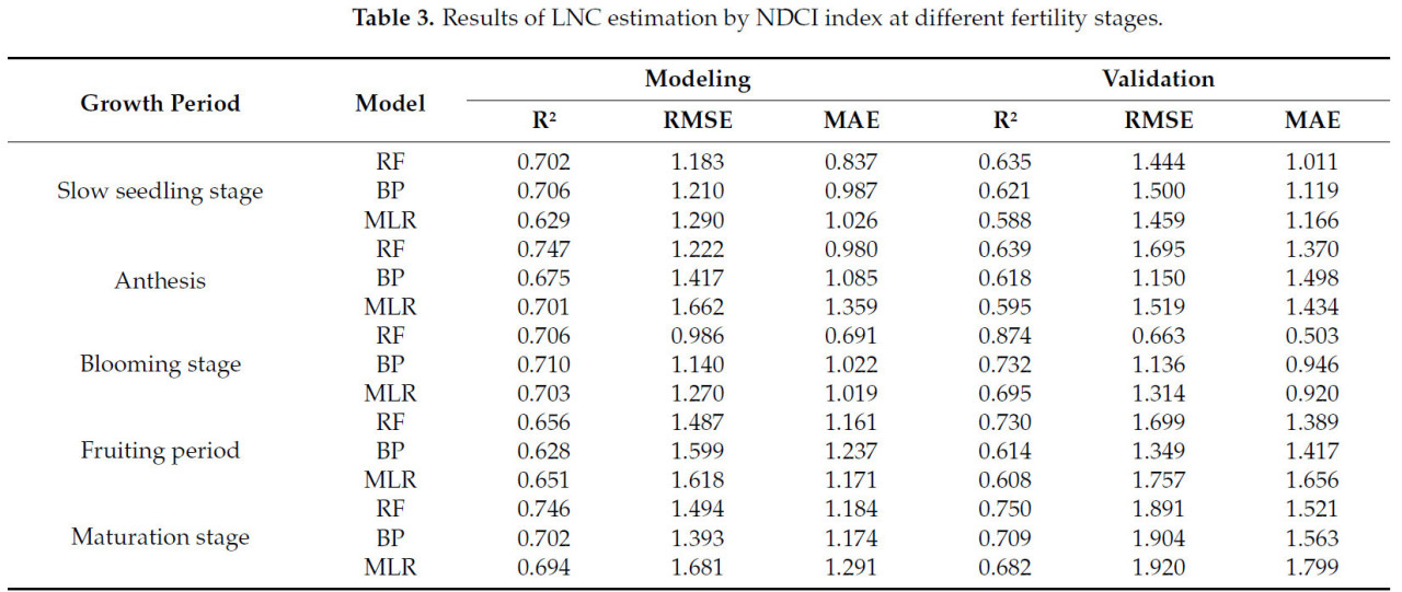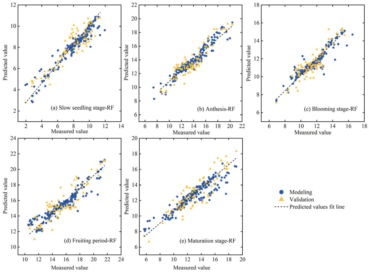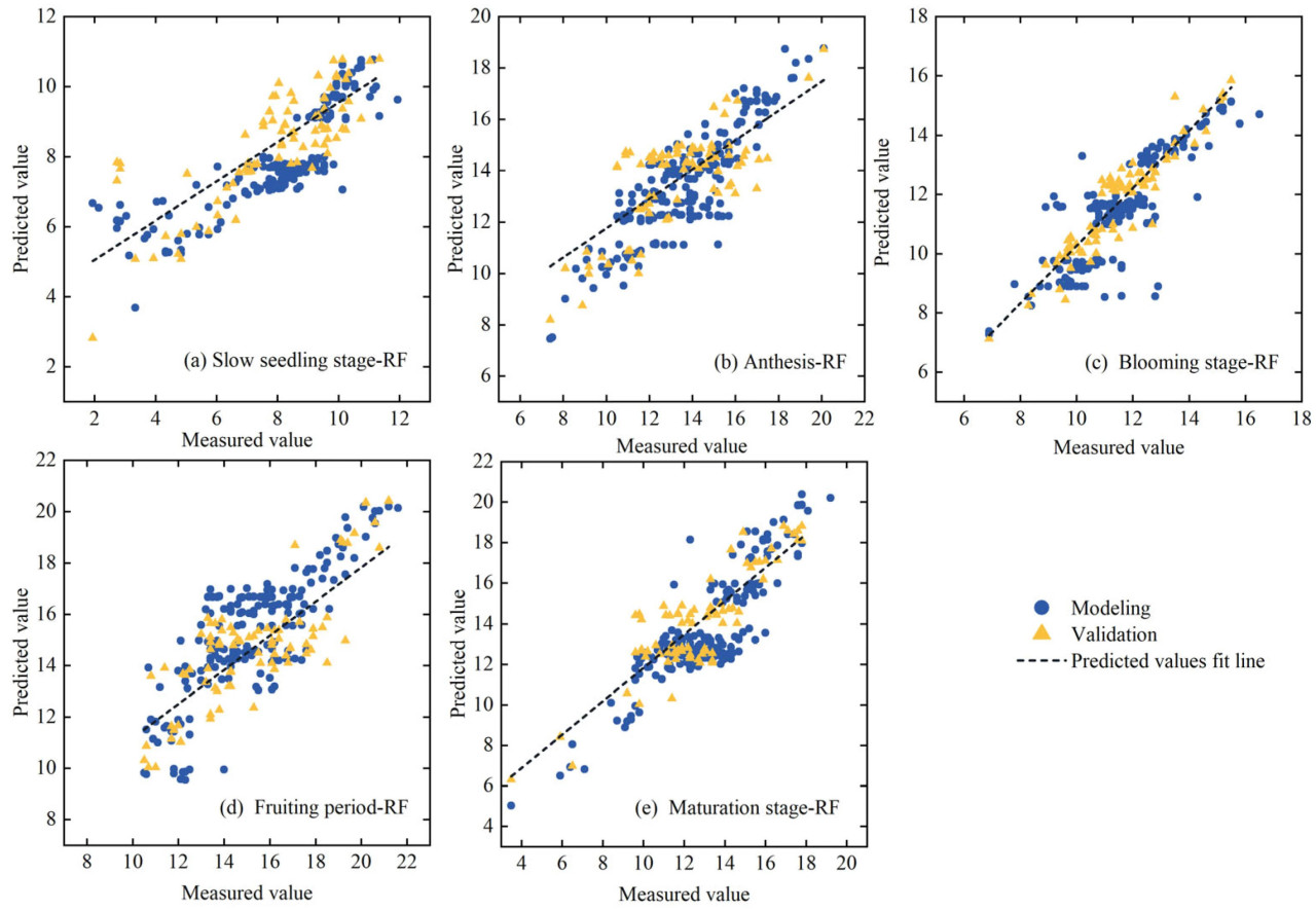 Результаты оценки САЛ с использованием индекса NDCI в качестве единственной переменной на разных стадиях роста, представленные в Таблице 3 и на Рисунках 6, 7 и 8, показывают, что среди трех моделей оценки модель RF продемонстрировала наиболее оптимальную производительность. В частности, на стадиях укоренения рассады и начала цветения объясняющая способность NDCI была относительно ограниченной, что привело к снижению стабильности модели и ограниченной эффективности оценки САЛ. Напротив, на стадии пика цветения NDCI проявил свою наиболее значительную прогностическую способность, при этом модель RF достигла R² 0,874, а также низких значений как RMSE, так и MAE. Это предполагает, что в период пика цветения физиологическая активность растений была на своем апогее, усиливая корреляцию между NDCI и содержанием азота в листьях, что дает наиболее точные прогнозы. Однако по мере перехода растений на стадии завязывания плодов и созревания наблюдалось заметное снижение прогностической эффективности модели. Значения R² на этапе проверки упали до 0,730 и 0,750, сопровождаясь значительным увеличением как RMSE, так и MAE. Это снижение производительности может быть связано с изменениями в потребностях растений в азоте на этих стадиях, так как растущие плоды оказывают сложное влияние на содержание азота в листьях, что усложняет прогностические способности модели.