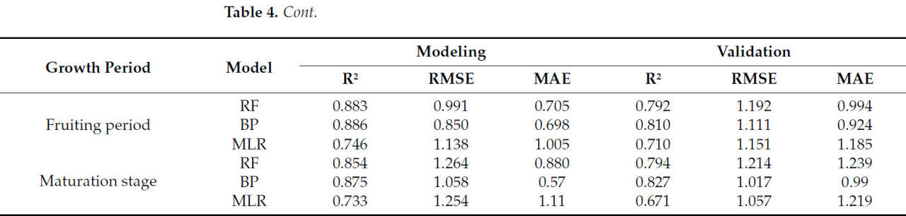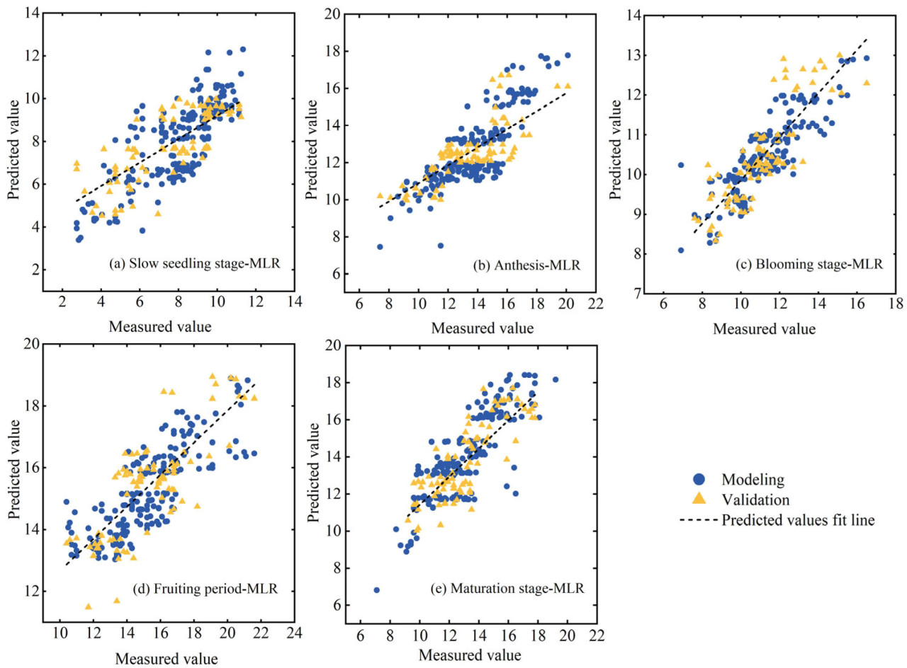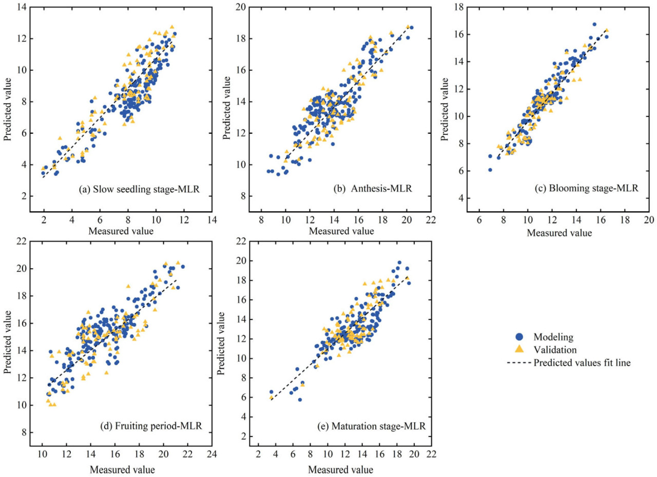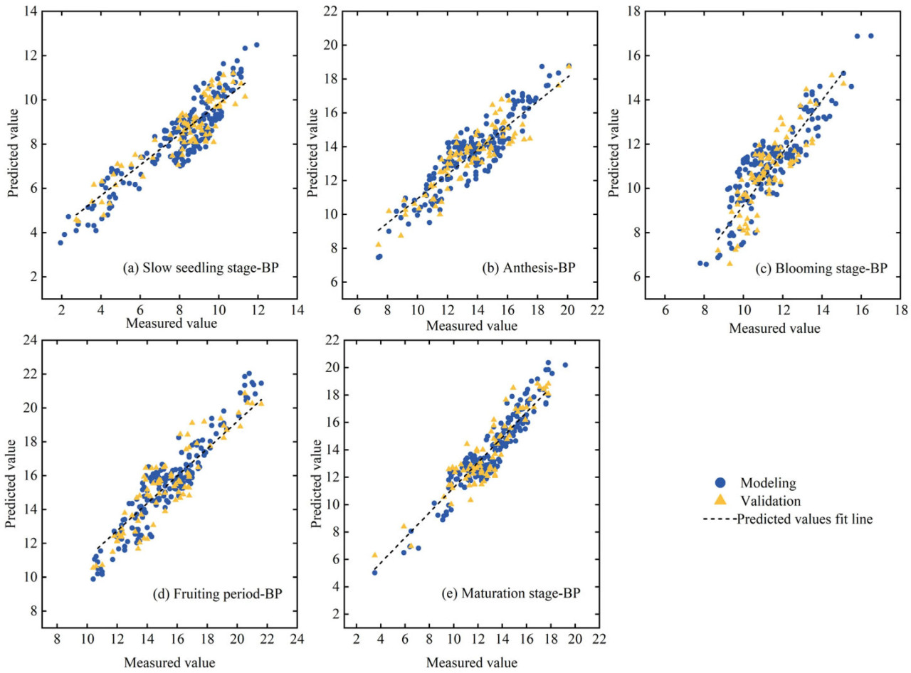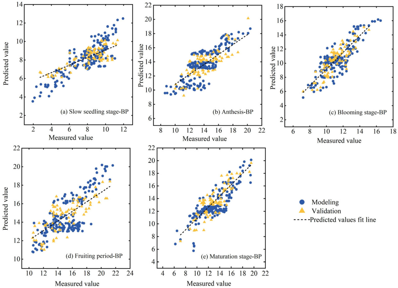 Результаты оценки САЛ с использованием различных индексов в качестве переменных на разных стадиях роста проиллюстрированы в Таблице 4 и на Рисунках 9, 10 и 11. На стадии укоренения рассады модель RF продемонстрировала наиболее превосходную производительность, со значениями R² 0,824 для обучающего набора и 0,825 для проверочного набора. На стадии начала цветения модель RF продолжала показывать хорошие результаты, достигнув значений R² 0,825 и 0,842 для обучающего и проверочного наборов соответственно. На стадии пика цветения модель МЛР превзошла модели BP и RF, достигнув значений R² 0,875 и 0,865 для обучающего и проверочного наборов соответственно. Эта фаза характеризовалась повышенной фотосинтетической активностью и значительными колебаниями САЛ, что позволило модели МЛР эффективно улавливать сложные взаимосвязи внутри данных. По мере продвижения растений на стадии завязывания плодов и созревания модель BP оказалась наиболее эффективной, со значениями R² 0,886 и 0,875 для обучающего набора, а также 0,810 и 0,827 для проверочного набора. В целом, очевидно, что эффективность различных моделей варьировала на протяжении различных периодов роста, причем модели, созданные на стадиях пика цветения и начала цветения, продемонстрировали наиболее надежные прогностические способности.