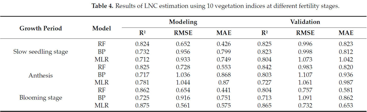 На основе корреляционного анализа между спектральными переменными и САЛ было замечено, что коэффициенты корреляции для TVI и SAVI на различных стадиях роста стабильно были ниже 0,20, что указывает на отсутствие значимой взаимосвязи. Следовательно, для моделирования были отобраны следующие спектрально-чувствительные переменные: NDCI, NDRE, NPCI, RVI, NDVI, TCARI, VARI, RERDVI, MTCI и SIPI. Примечательно, что NDCI показал самую высокую корреляцию на стадии цветения, достигнув впечатляющих 0,75. В свете этого результата NDCI был выбран в качестве единственной переменной, наряду с вышеупомянутыми десятью чувствительными спектральными переменными, для построения трех различных моделей, а именно BP, МЛР и RF. Каждая модель была подвергнута проверке точности, чтобы определить наиболее оптимальную модель оценки.