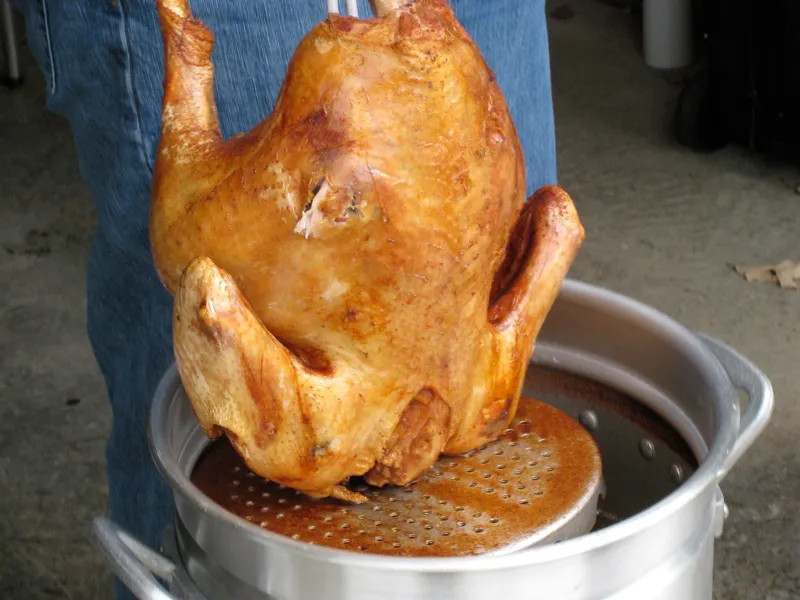 Очевидный недостаток жарки во фритюре — возгорание жира, но не стоит упускать из виду и другую опасность: недожаренную птицу. Индейку следует готовить примерно три минуты на каждый фунт веса. Прежде чем объявить её готовой, проверьте с помощью термометра для мяса, достигла ли внутренняя температура не менее 155°F (70°C). После того, как вы достанете её из масла, дайте ей остыть около 20 минут, прежде чем нарезать. За это время птица продолжит готовиться и в конечном итоге достигнет безопасной внутренней температуры 165°F (74°C). Если вы хотите быть абсолютно уверены, вы можете воткнуть термометр в отдохнувшую птицу и следить за тем, чтобы она достигла этой отметки.
