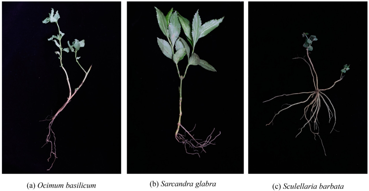 Чтобы продемонстрировать надежность метода 3D-реконструкции, для данного исследования были выбраны корневые системы трех видов травянистых растений на стадии проростков, как показано на рисунке 1, включая корни Ocimum basilicum (базилик), обозначенные как Ob, корни Sarcandra glabra (саркандра), обозначенные как Sg, и корни Scutellaria barbata (шлемник), обозначенные как Sb. Корневая система каждого вида обладала уникальными характеристиками. Ocimum basilicum — растение со стержневой корневой системой, которая на стадии проростка состоит из конусовидного главного корня и мочковатых корней, причем главный корень обладает высокой структурной прочностью. Sarcandra glabra — растение с мочковатой корневой системой, которая на стадии проростка является мочковатой и относительно плотной, с высокой структурной прочностью, что делает ее менее подверженной взаимному затенению. Scutellaria barbata — растение с мочковатой корневой системой, которая на стадии проростка в основном состоит из собранных в пучки тонких мочковатых корней, демонстрируя низкую структурную прочность и сильное затенение между корнями. В этом исследовании реальные значения фенотипических параметров корней были получены путем ручных измерений. После сбора изображений корневых систем количество корней было подсчитано вручную. Впоследствии корневые системы каждого образца были подвергнуты разрушающему отбору проб, каждый корень был распрямлен, а затем каждый корень был измерен штангенциркулем. Сумма длин каждого корня принималась за общую длину корней для каждого образца.
