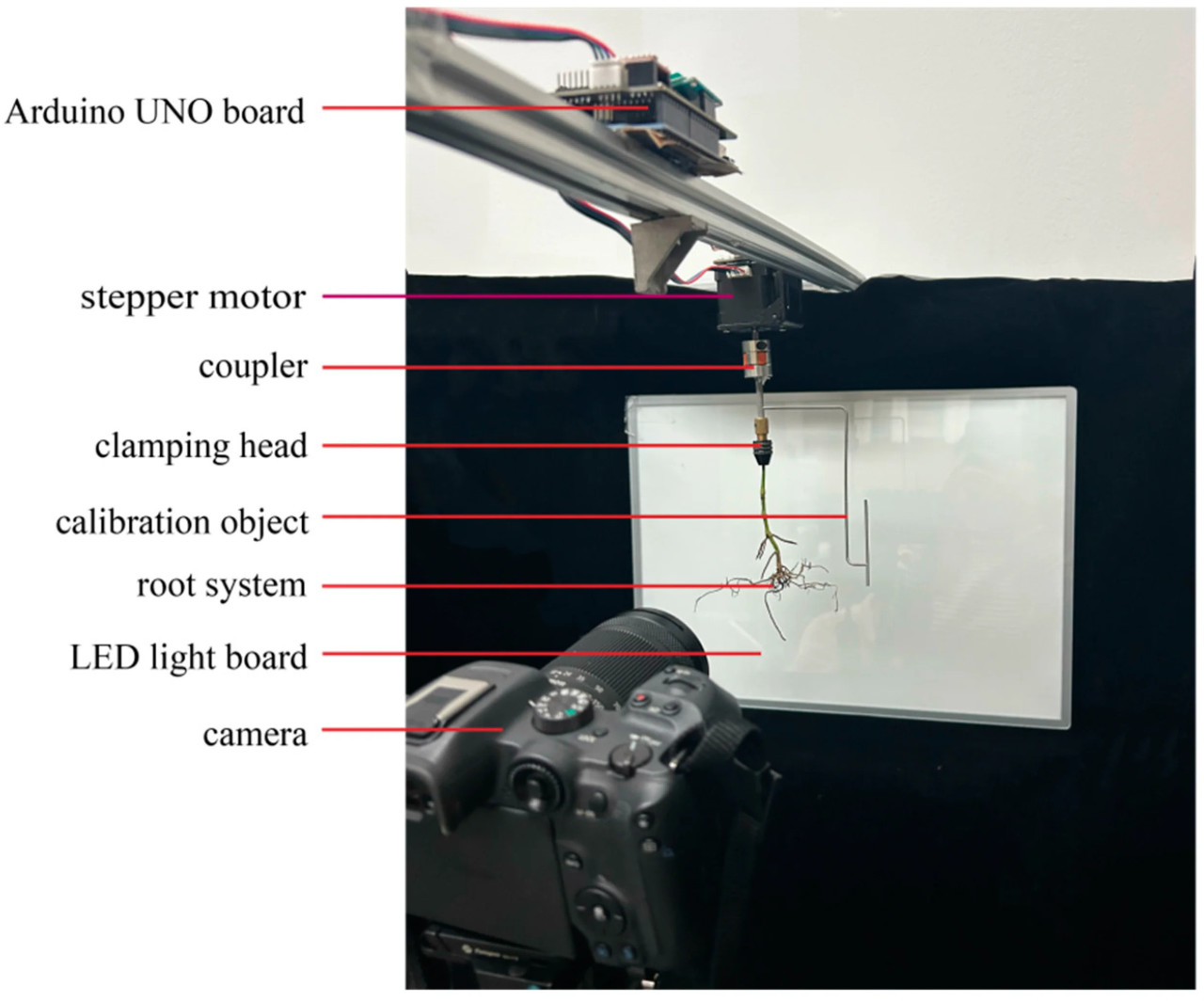 Была спроектирована и сконструирована предложенная система многовидового захвата изображений для 3D-реконструкции корневых систем, как показано на рисунке 2. Система захвата изображений включала в себя шаговый двигатель, плату Arduino UNO, муфту, калибровочный объект, зажимную головку, светодиодную панель, камеру (Canon R7) и алюминиевые профили. Шаговый двигатель управлялся платой Arduino UNO, муфта использовалась для соединения двигателя с калибровочным объектом, а зажимная головка использовалась для зажима корневой системы. Для масштабирования и выравнивания был разработан калибровочный объект, который также представлял собой тонкую структуру. Чтобы облегчить сегментацию корневой системы и калибровочного объекта, обозначенных как целевой объект, от фона, для обеспечения контрового света использовалась светодиодная панель. Двигатель и плата Arduino UNO были закреплены на раме, изготовленной из алюминиевых профилей. Шаговый двигатель, муфта, калибровочный объект и зажимная головка были соединены последовательно. Во время сбора данных шаговый двигатель приводил во вращение целевой объект, а камера, закрепленная с одной стороны, захватывала многовидовые изображения целевого объекта.
